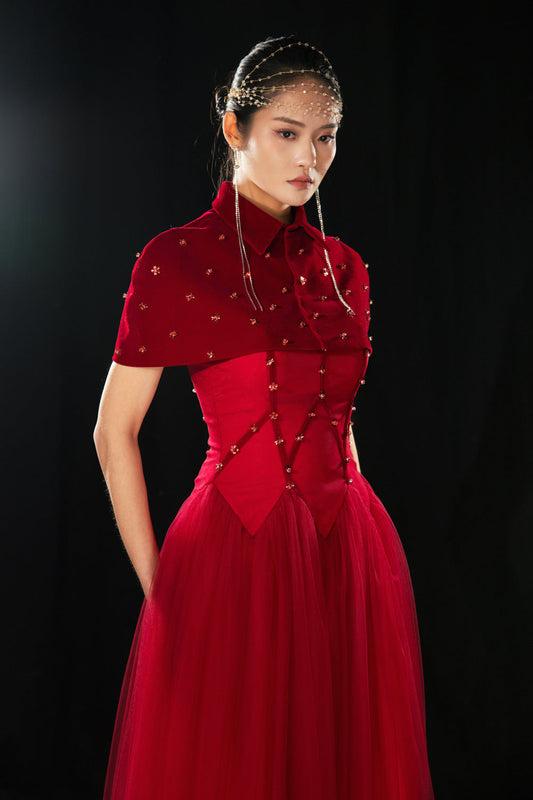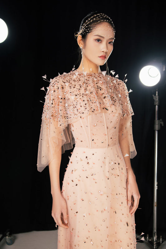 Hayes A-line Cape Sleeved Mesh Silk Floor Length Set