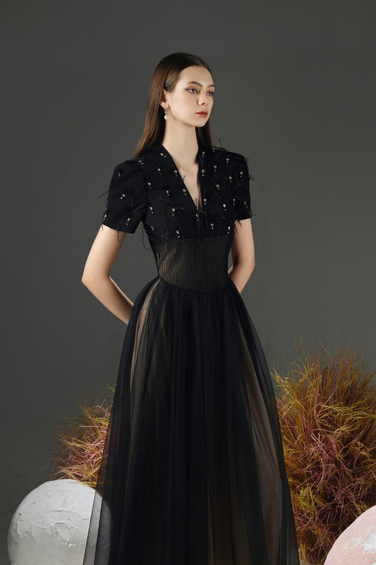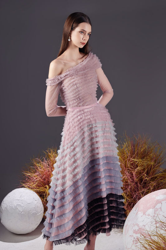 Cosmo Gathered V-Neck Mesh Taffeta Ankle Length Dress