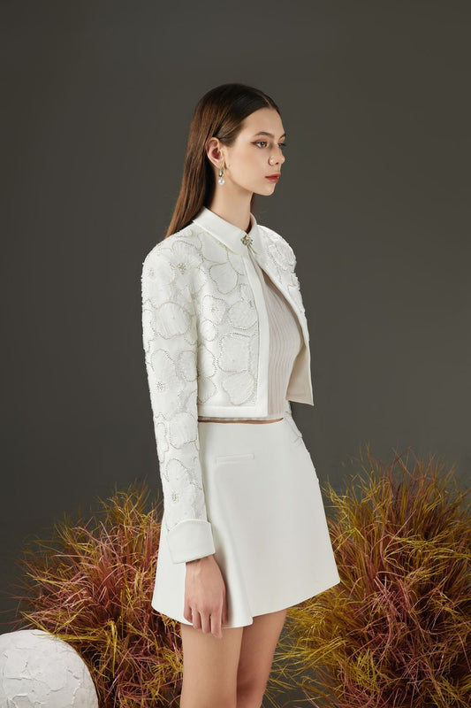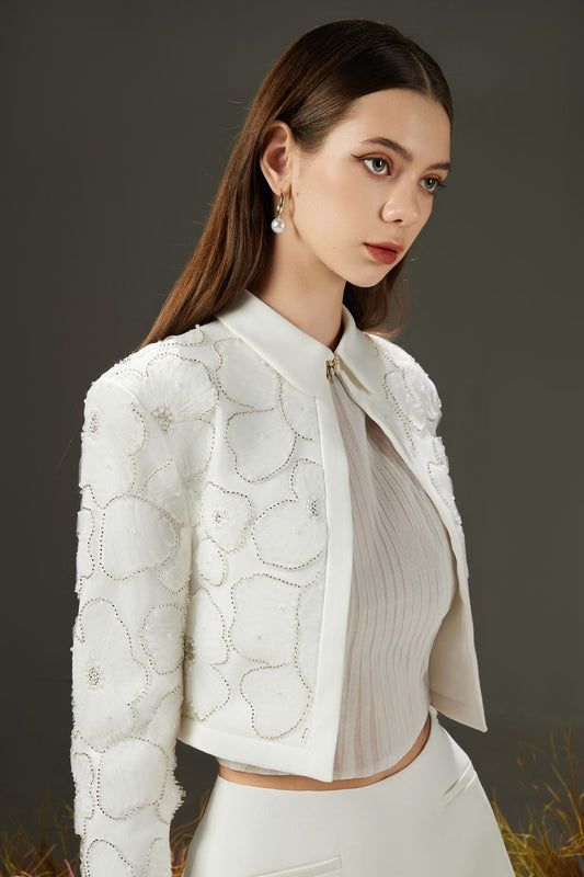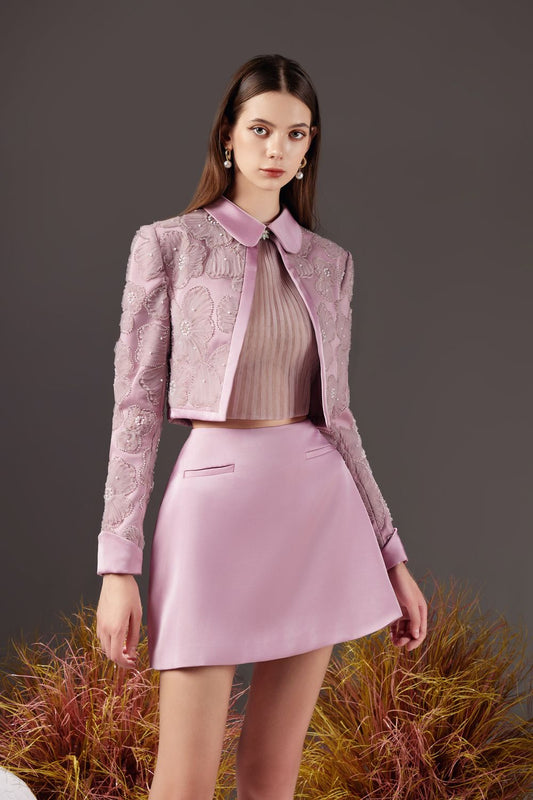 Cyan Cropped Rounded Flat Collar Taffeta Silk Jacket