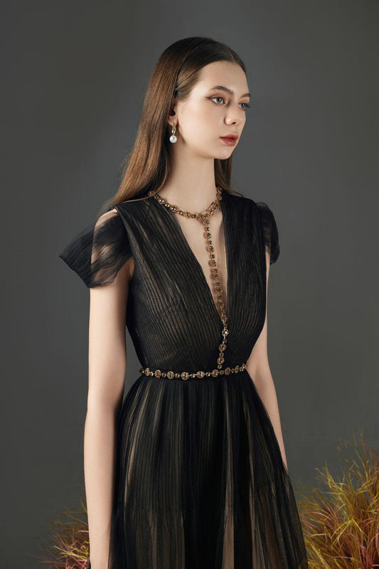 Chandler Pleated Halter Neck Mesh Sheer Maxi Dress