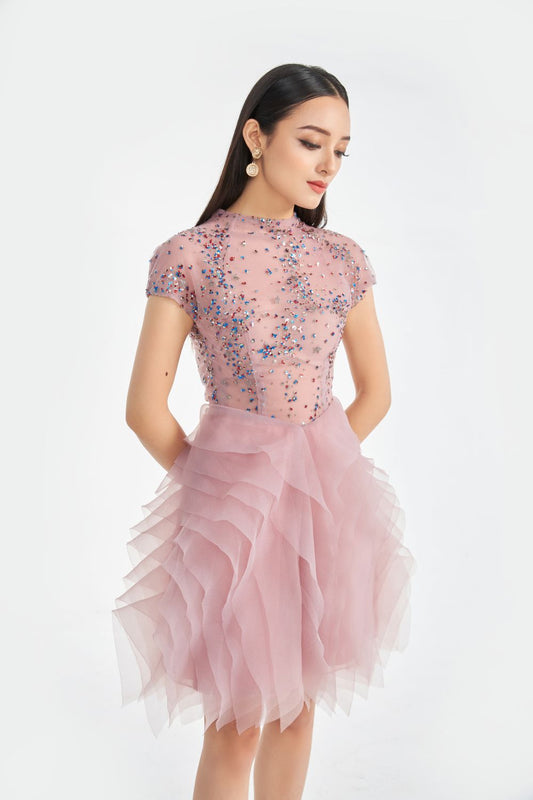 Marilyn A-line Short Sleeved Organza Mini Dress