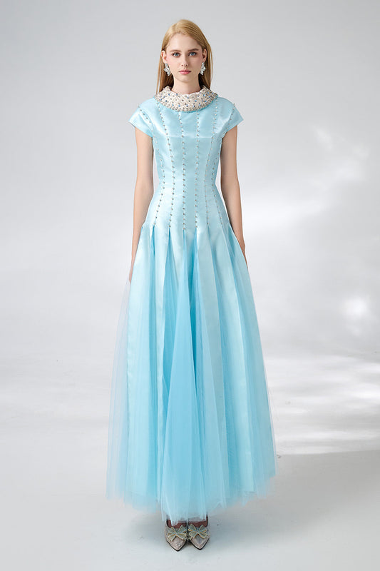 Zuniga Gored High Neck Mesh Silk Maxi Dress