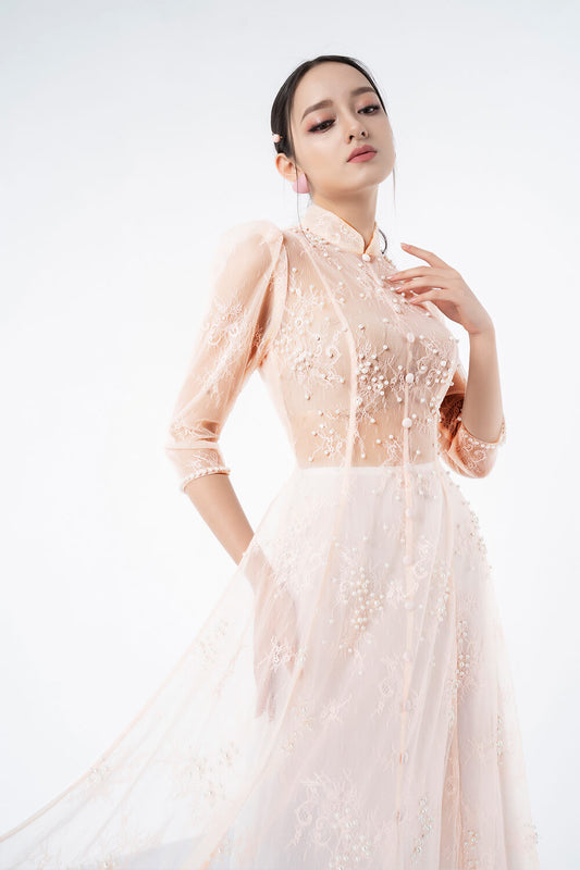 Maeve Fitted Flower Applique Mesh Sheer Long Length Ao Dai