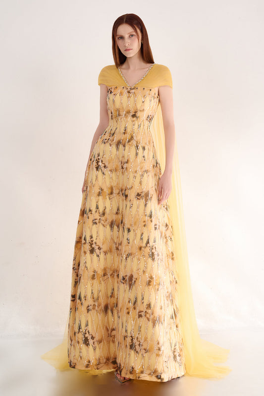 Blakely Ball Gown Cape Sleeved Organza Maxi Dress