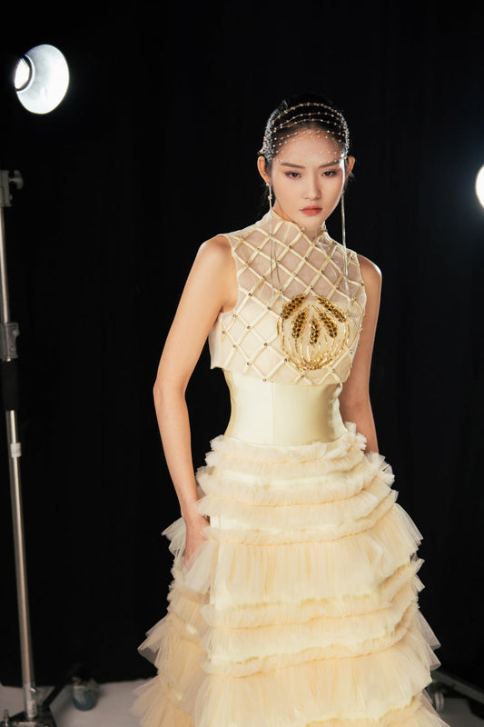 Kyleigh Layered Side Slit Mesh Silk Floor Length Dress