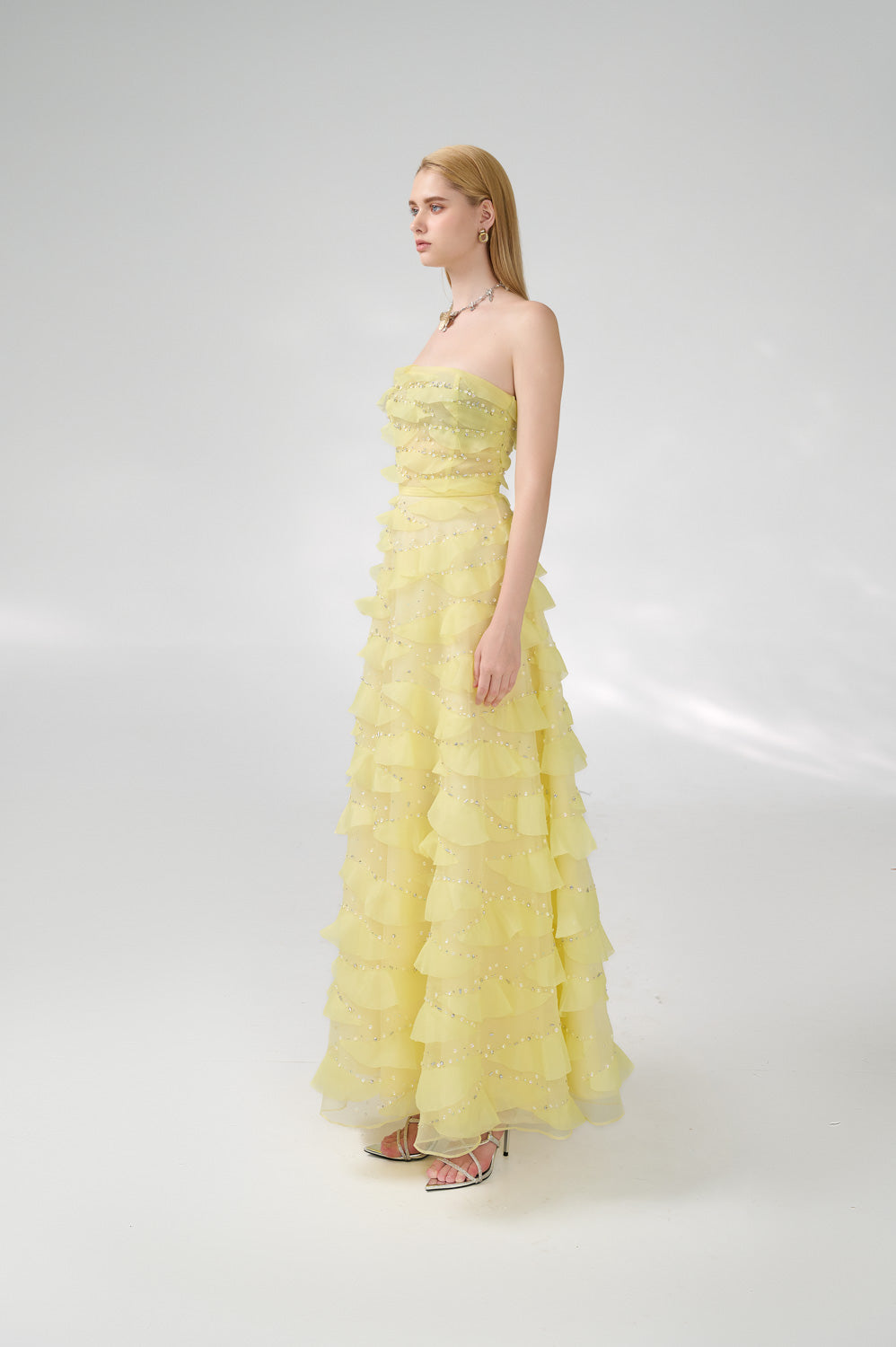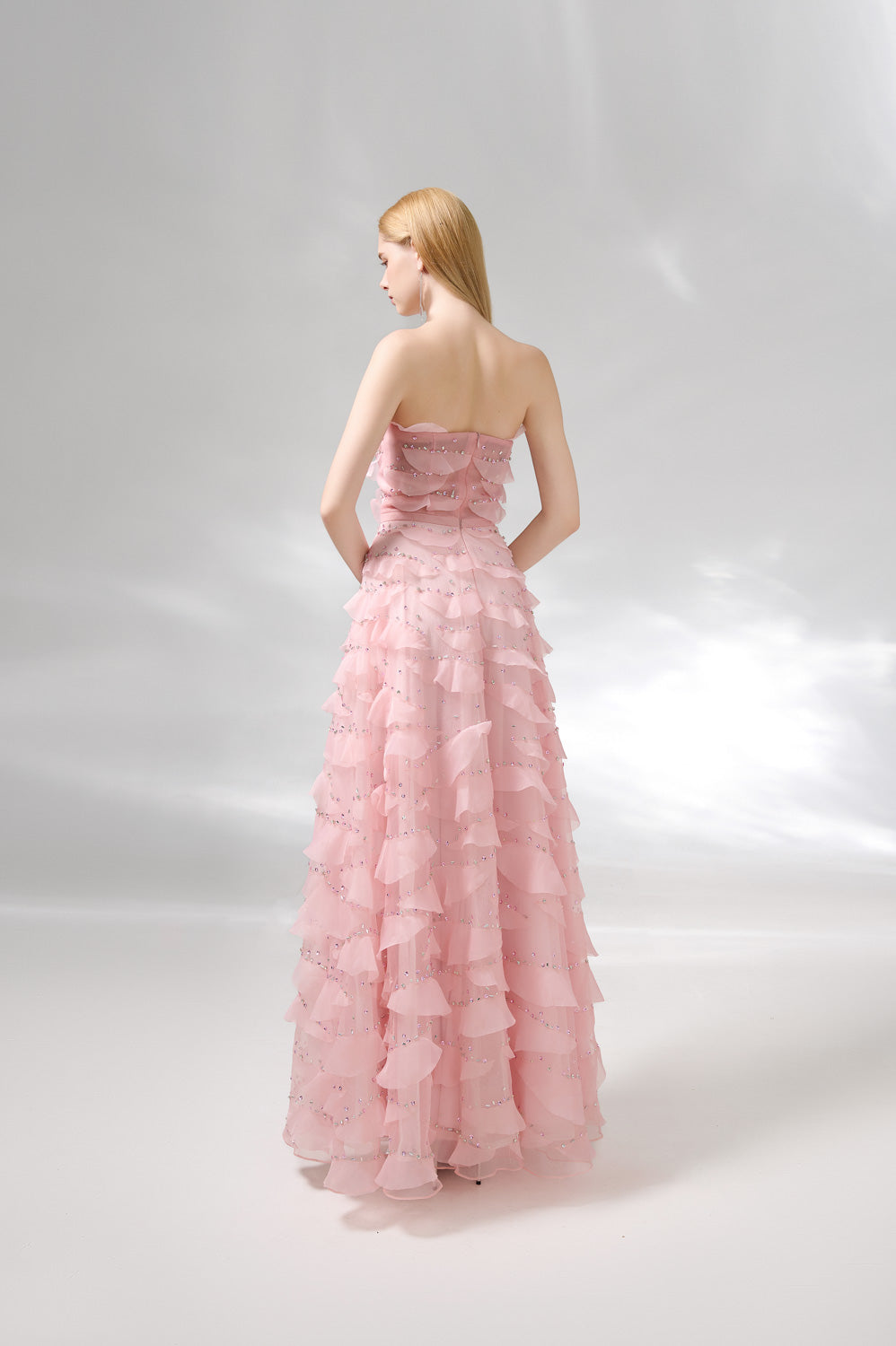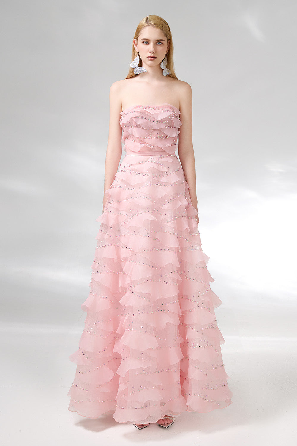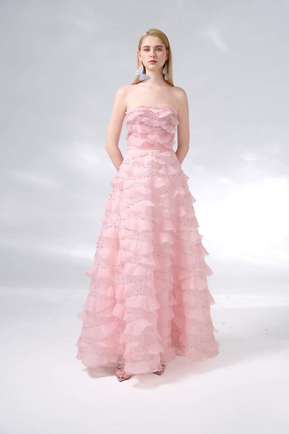 This dress is the perfect choice for a formal event. The dress features an elegant strapless design and is made of high-quality organza fabric. Its floor length adds a touch of sophistication to any occasion. Make a statement with this beautiful dress.