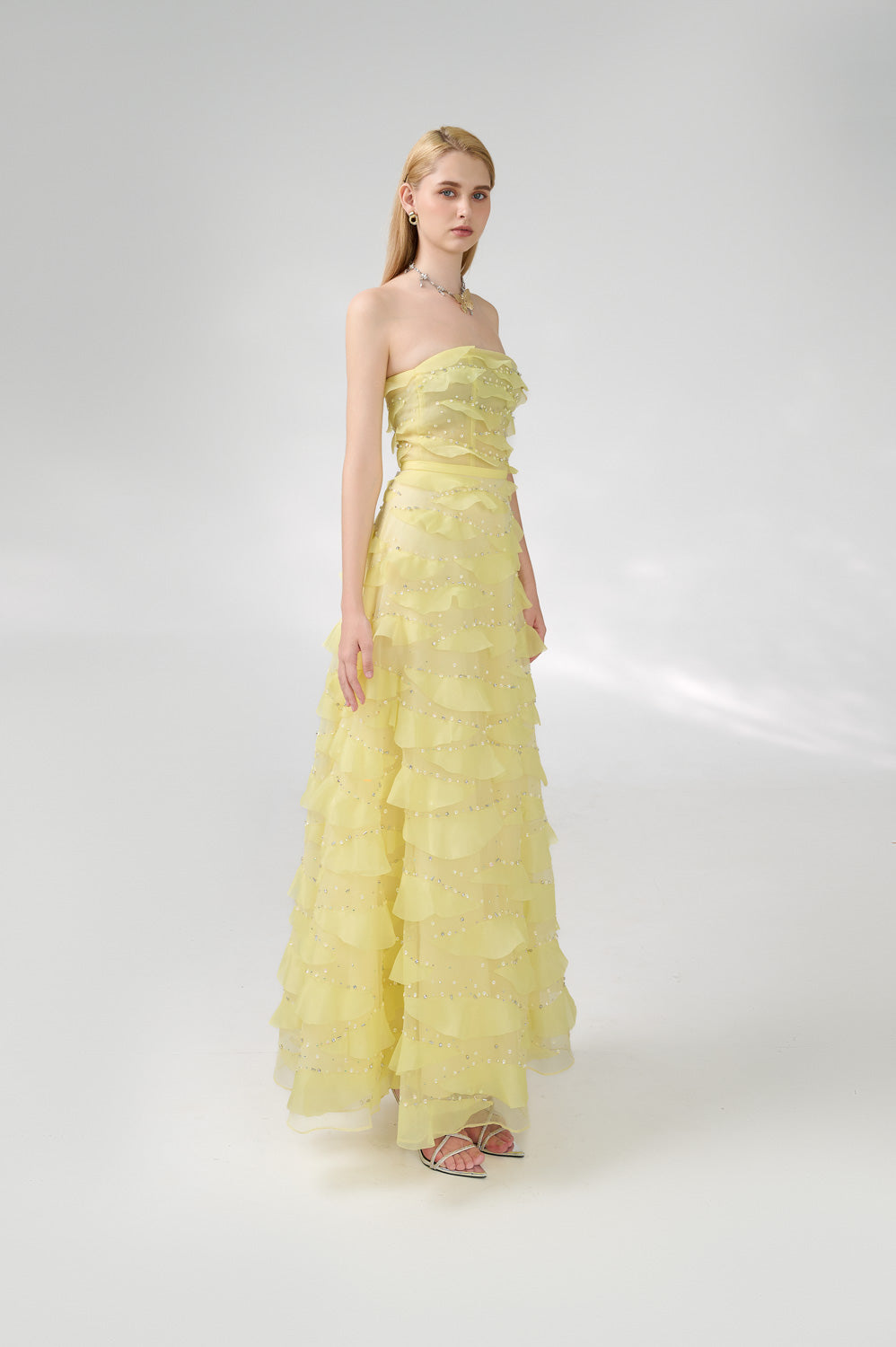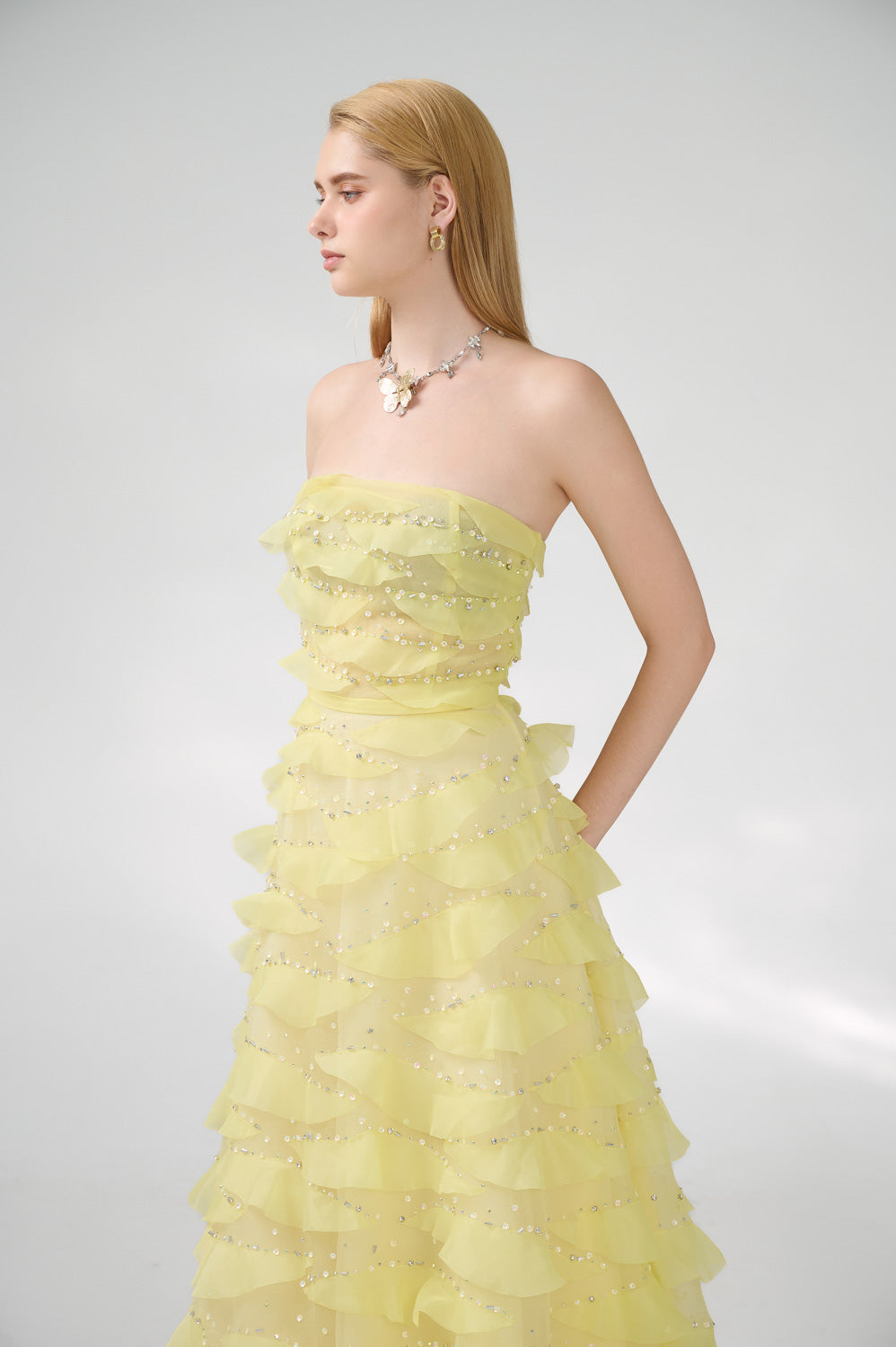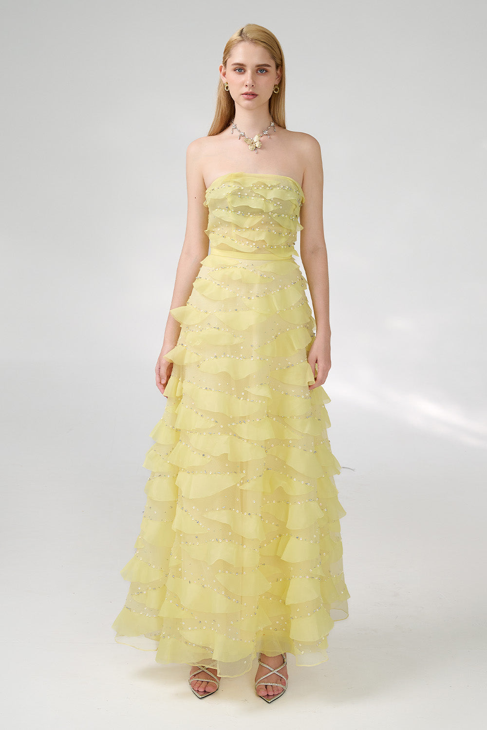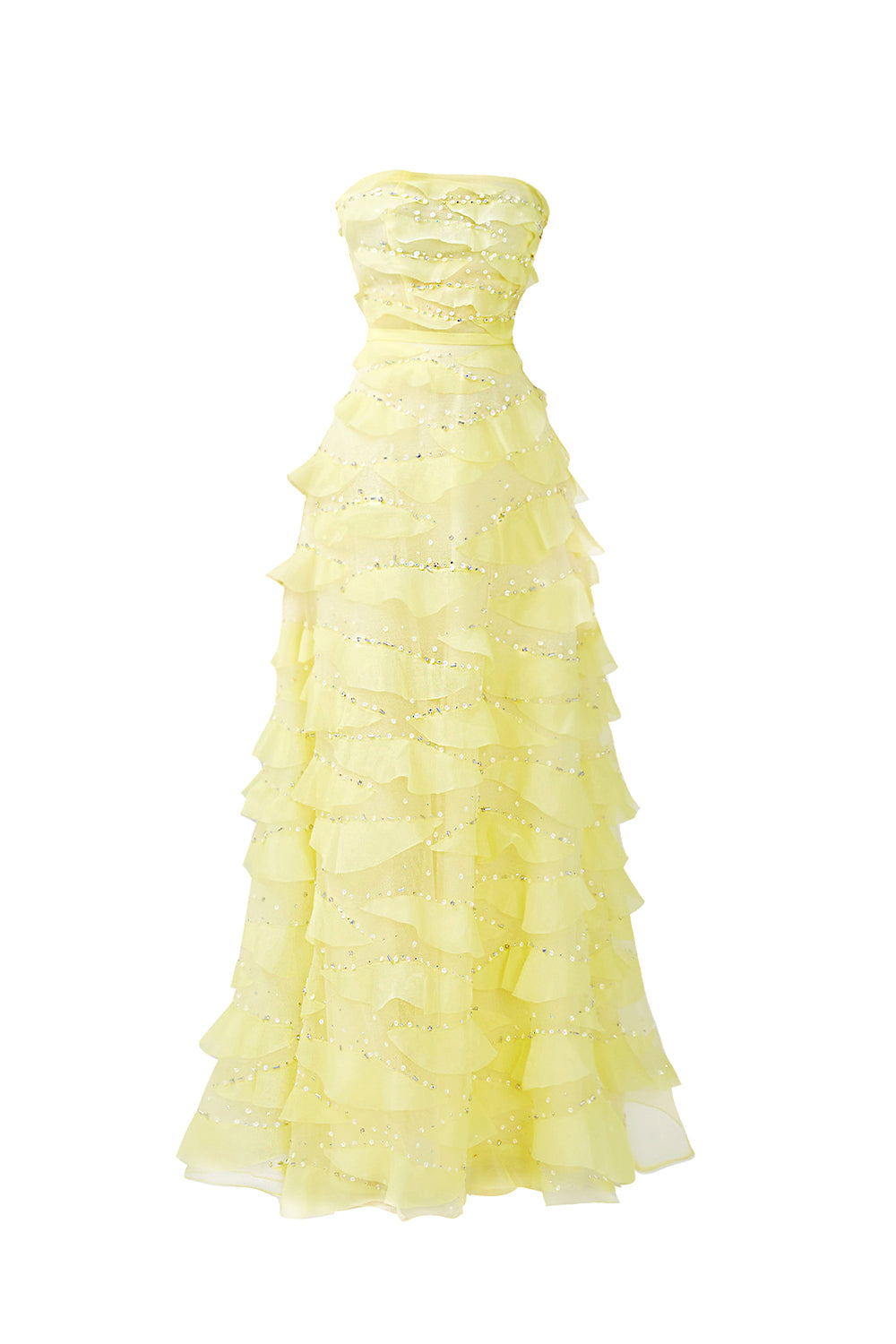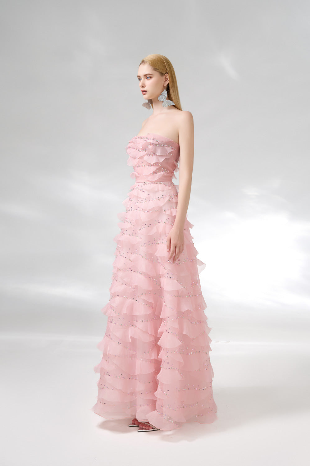 This dress is the perfect choice for a formal event. The dress features an elegant strapless design and is made of high-quality organza fabric. Its floor length adds a touch of sophistication to any occasion. Make a statement with this beautiful dress.