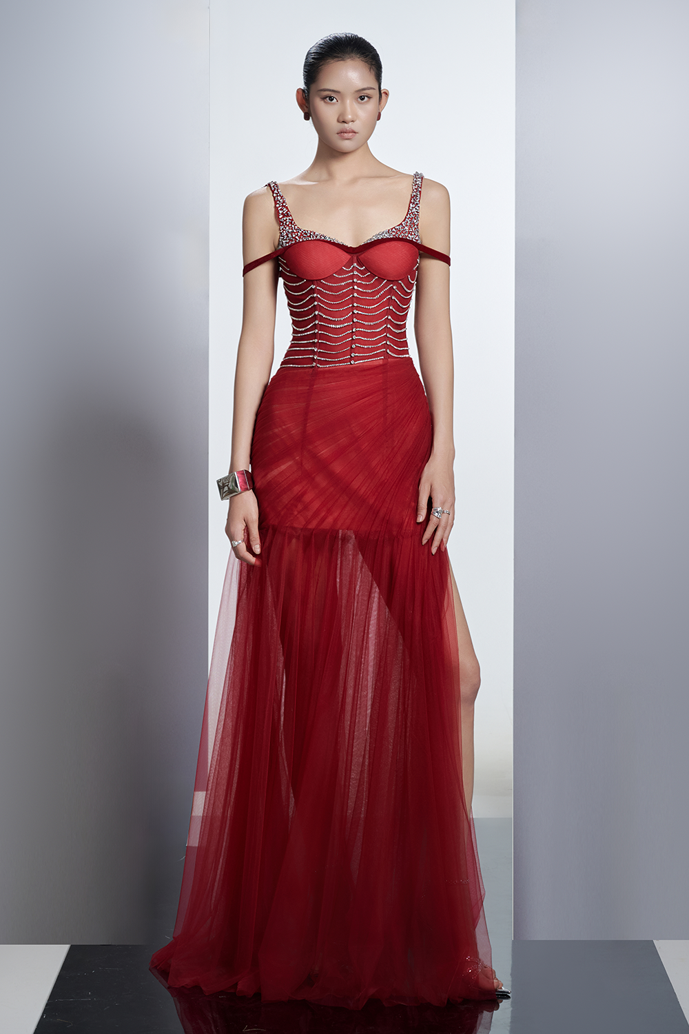 - Special Features: Corset waist with stones, Wide horizontal sleeve straps, Gathered skirt with side slit, Drop waist skirt, Chest cup