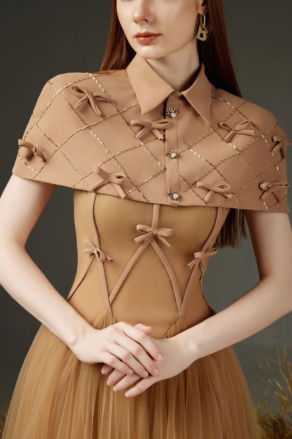 - Special Features: Handcrafted bow tie, Attached beads in rhombus-shaped- Apparel Silhouette: Pleated
