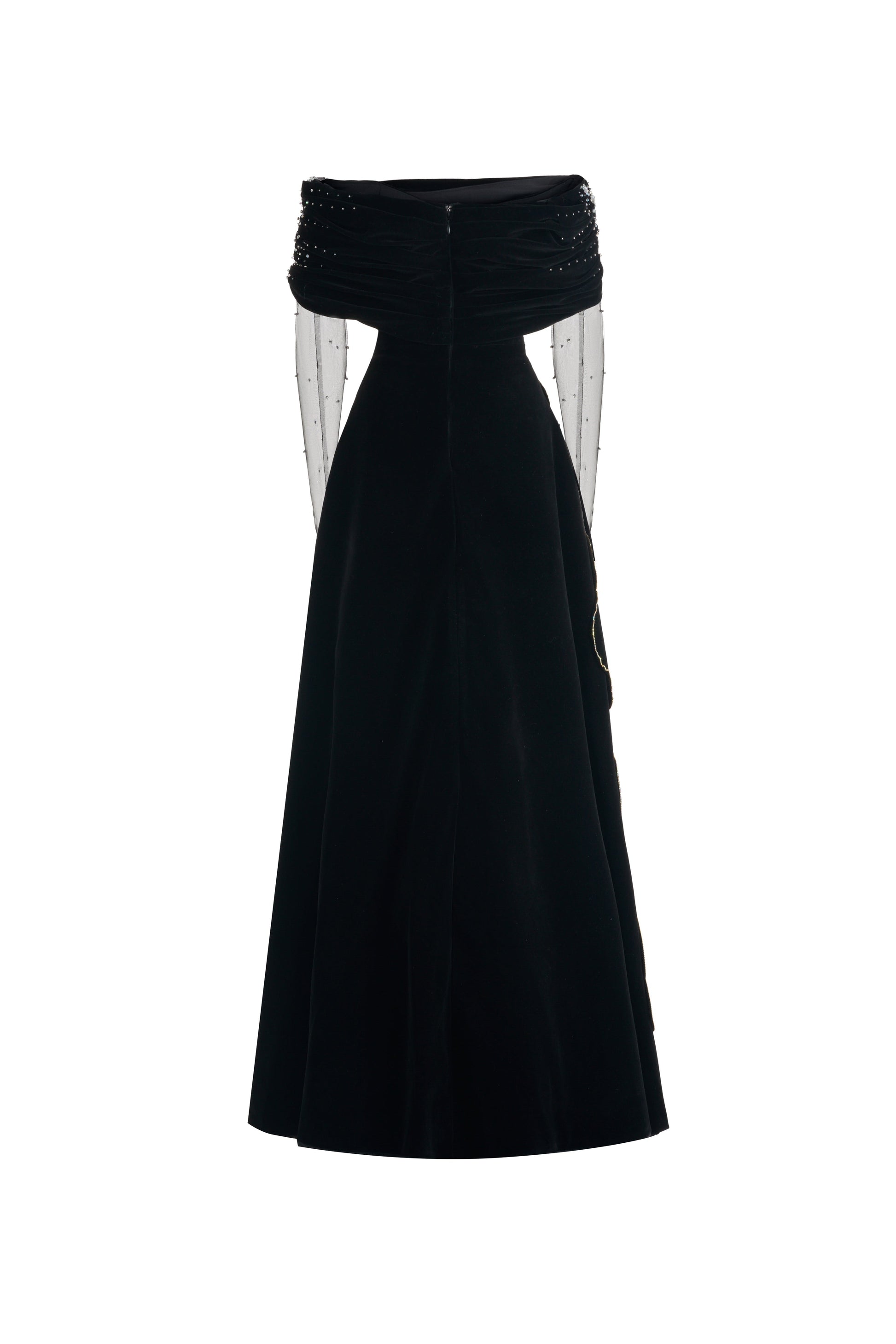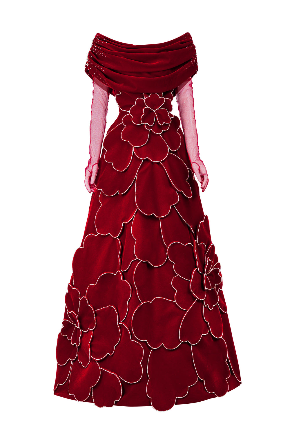 Special Features Draped off-shoulder design with crystals, Attached rhinestone as petals shape, Sheer gloves with bead