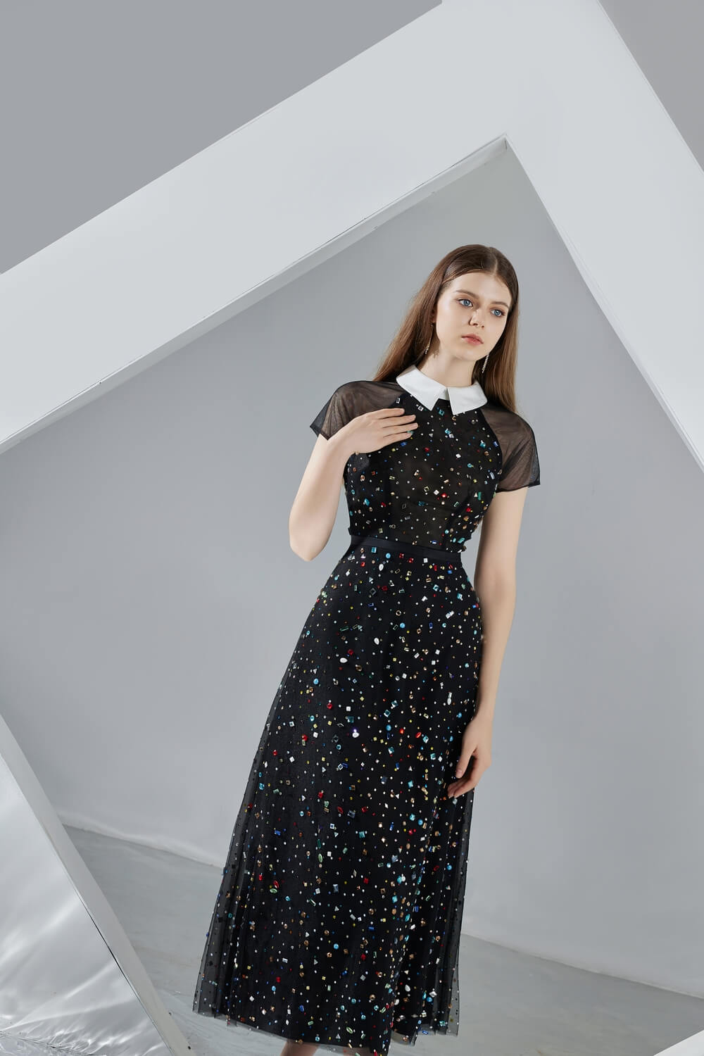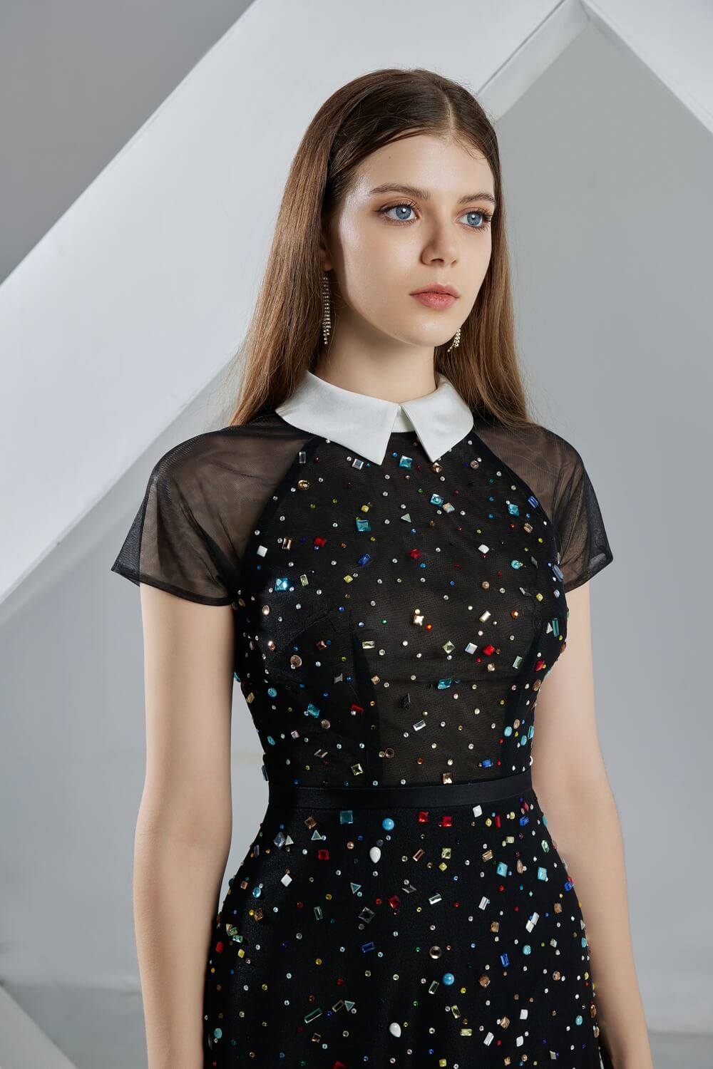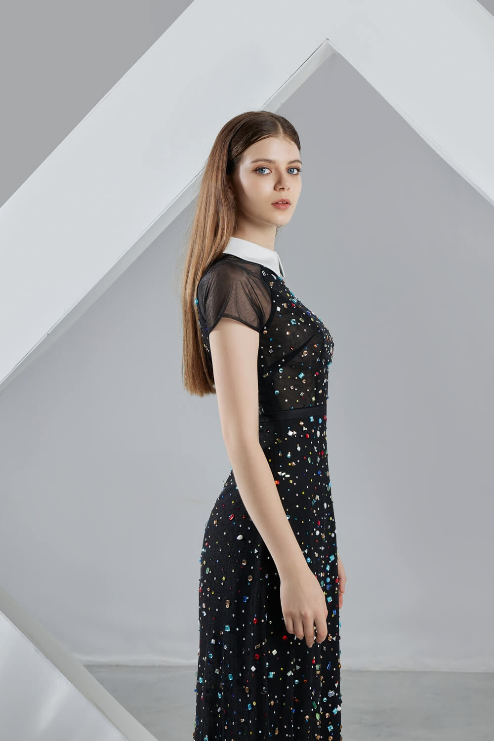 This dress features a shirt collar, short sleeves, and a stunning A-line skirt. With an attached stone detail, this dress is perfect for special occasions. Feel elegant and sophisticated in this beautiful midi dress.