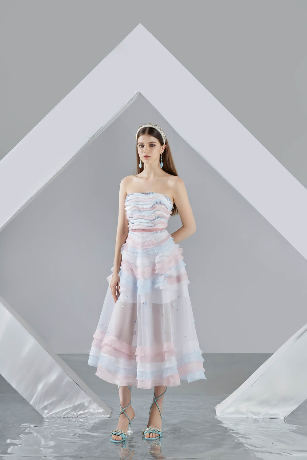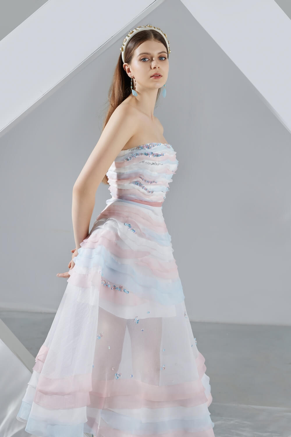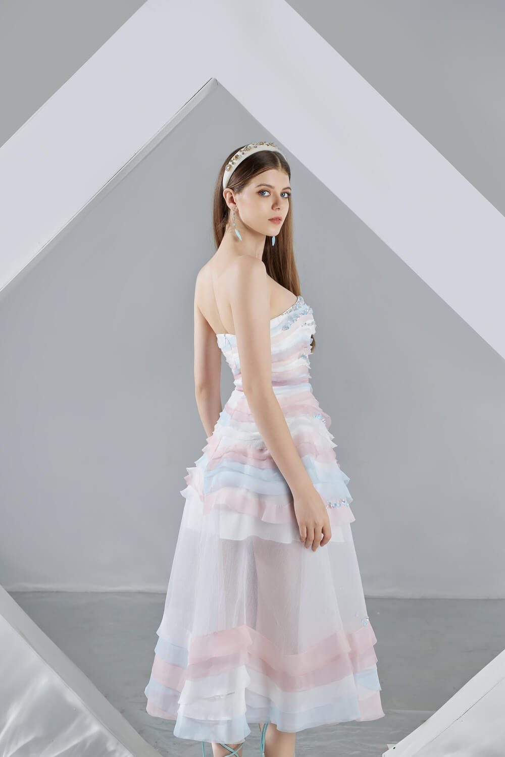 This dress is perfect for any special occasion. Its strapless design and layered organza fabric provide a unique, eye-catching look that is sure to stand out in the crowd. With its midi length, this dress is perfect for formal wear and is sure to make a statement.