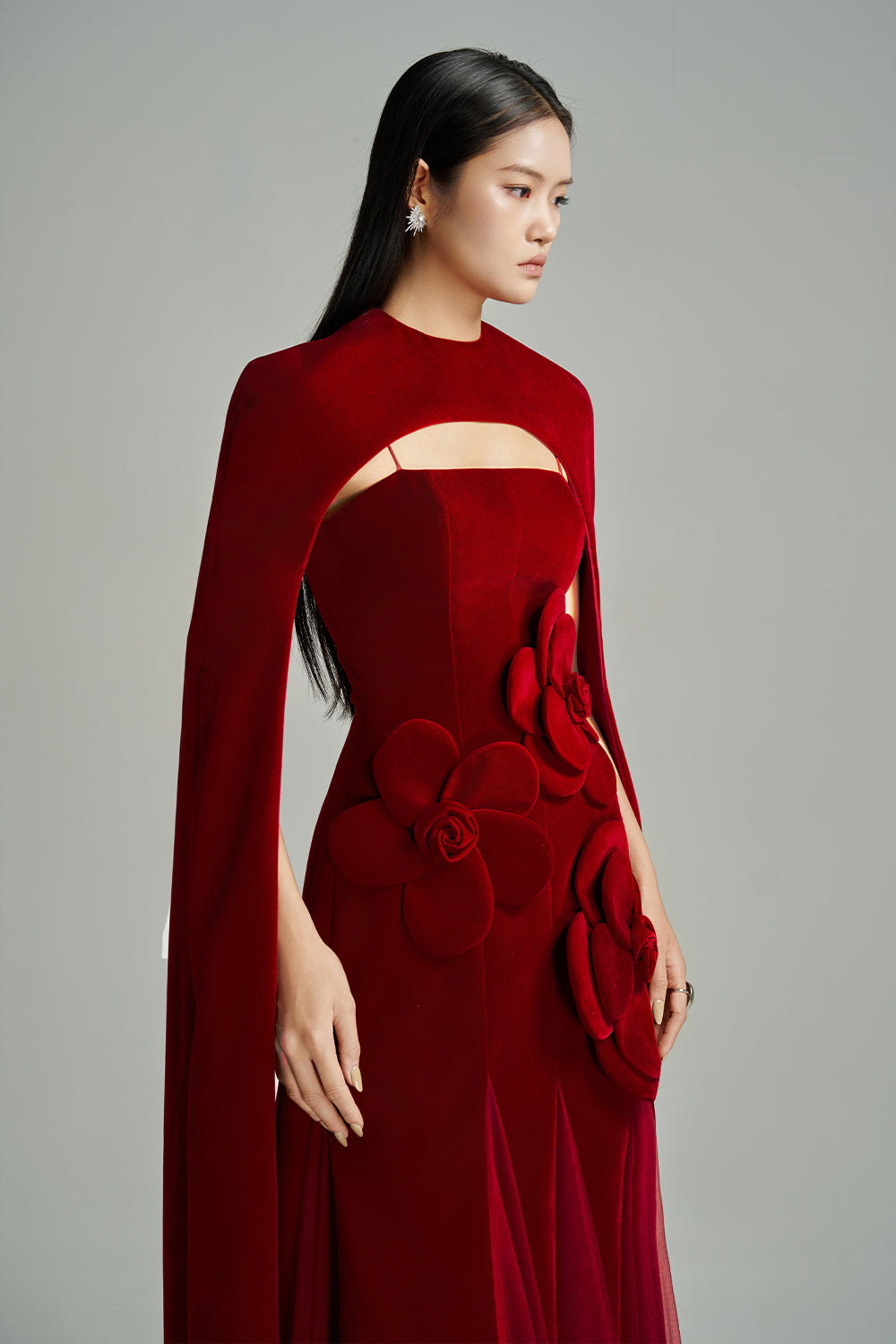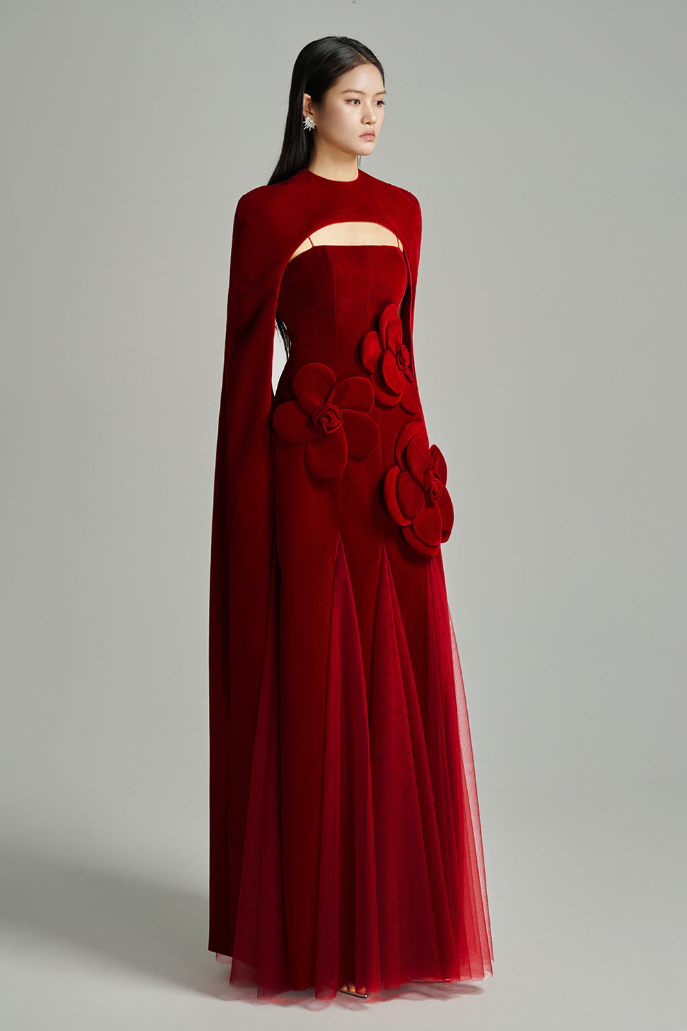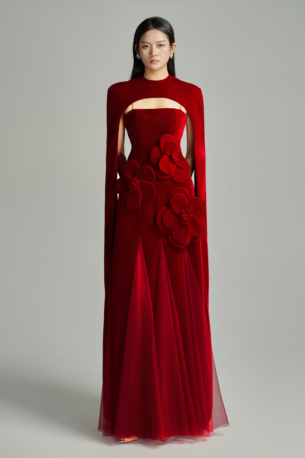 This elegant set is a must-have for any fashion-forward individual. Made from high-quality polyester, this set features delicate flower appliques on the cape, adding a touch of femininity to the classic maxi silhouette. Perfect for any special occasion, this set offers both style and comfort.