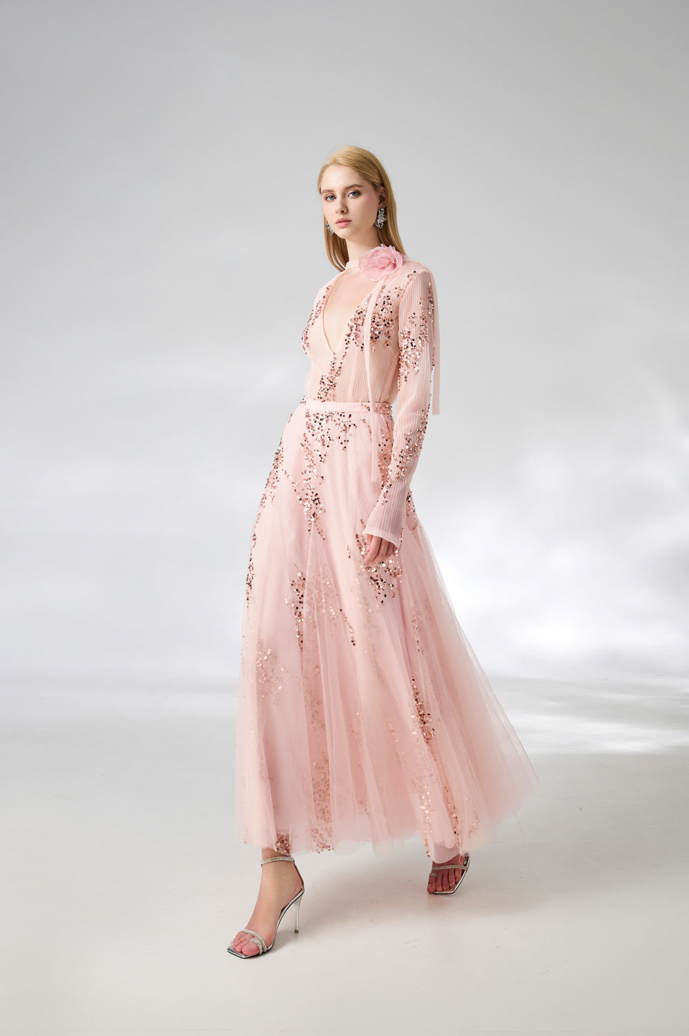 - Special Features: V-neck style with scarf across, 3D floral on one side, Gathered skirt, Attached sequin on the dress