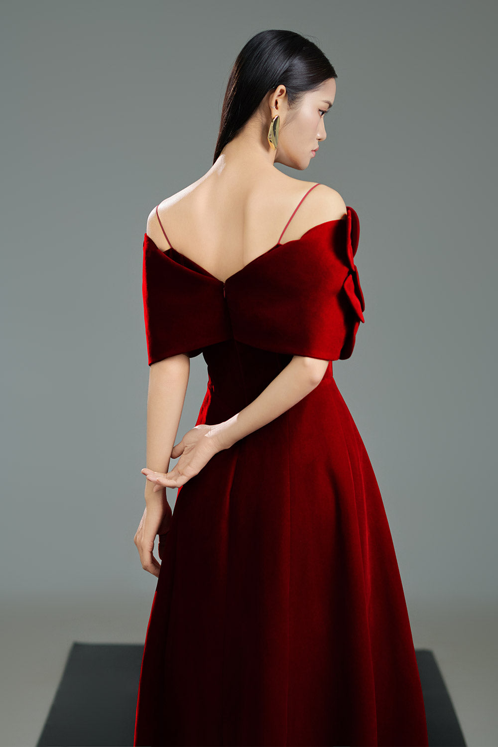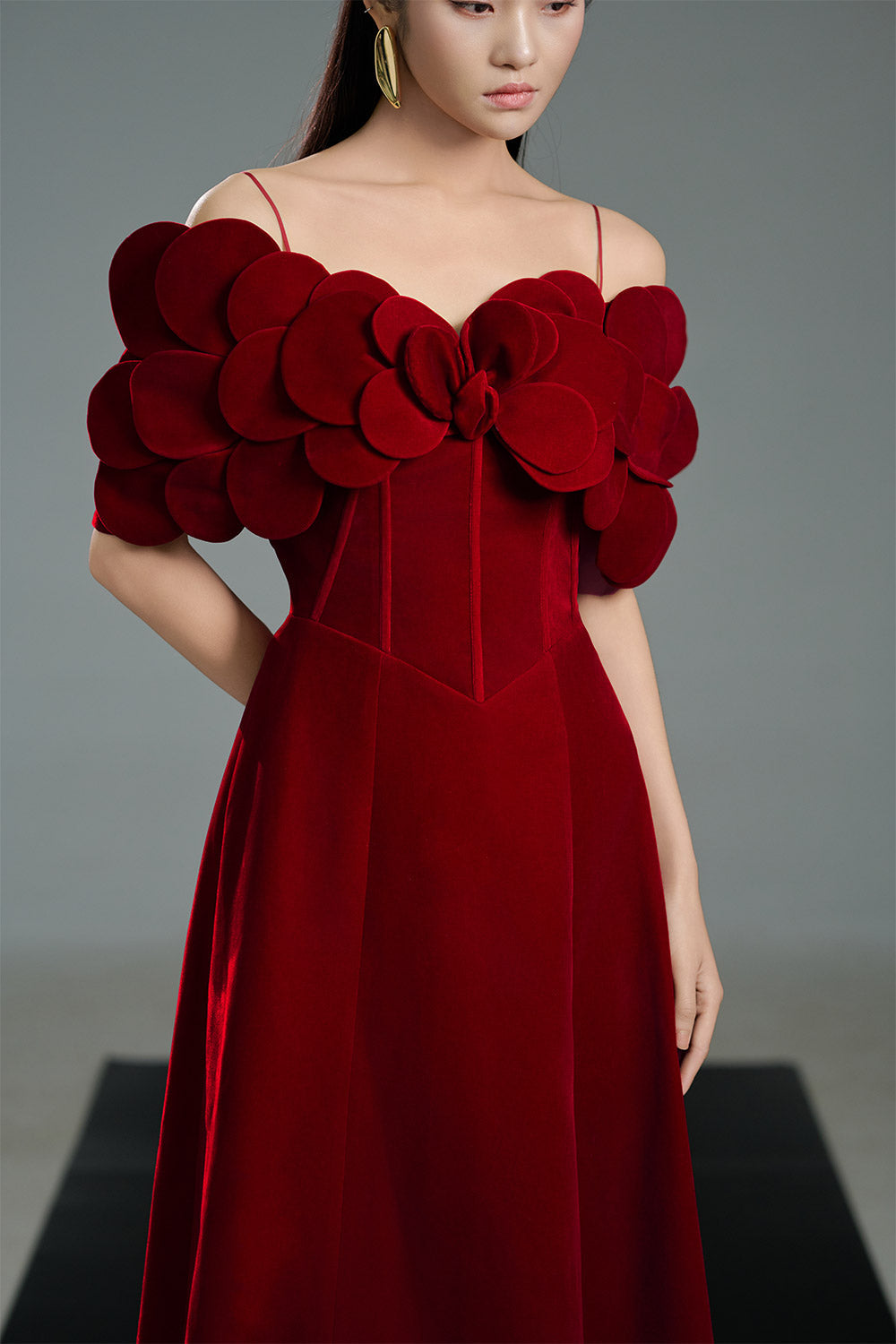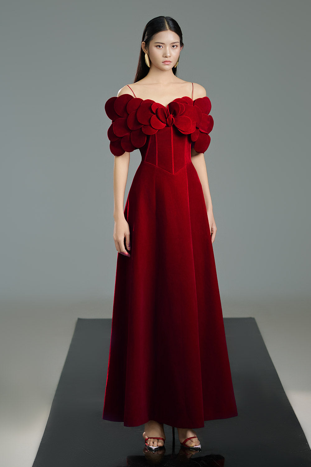 • Special Features: Layered petal-like details, Corset waist design, Draped