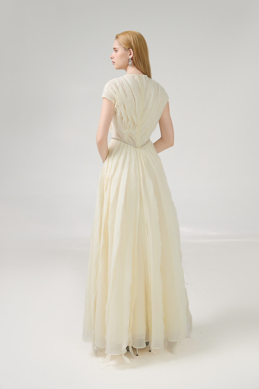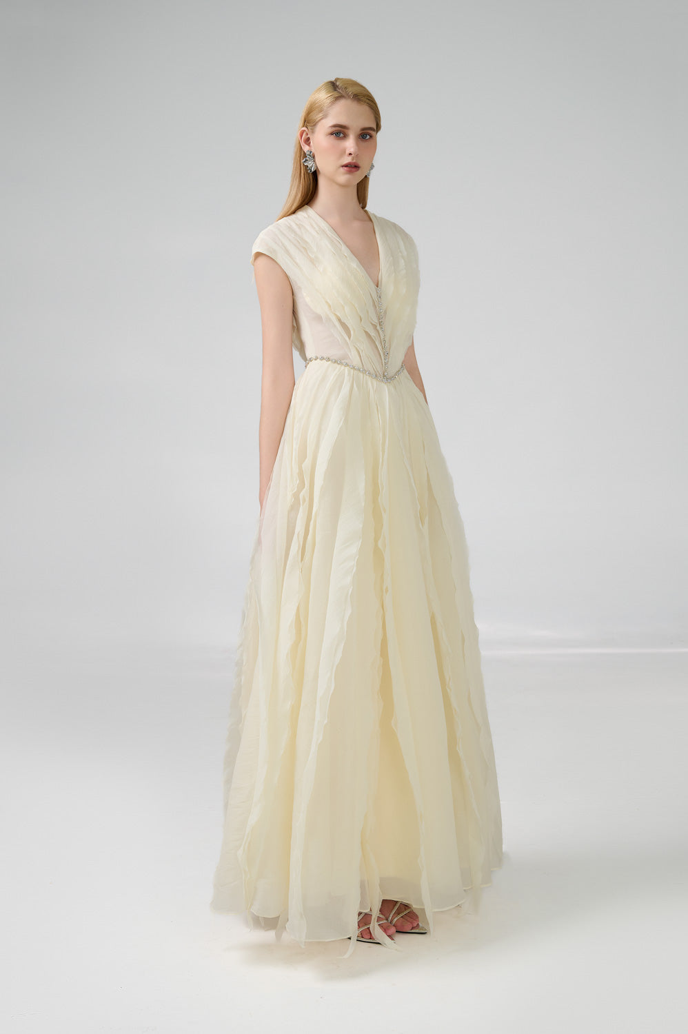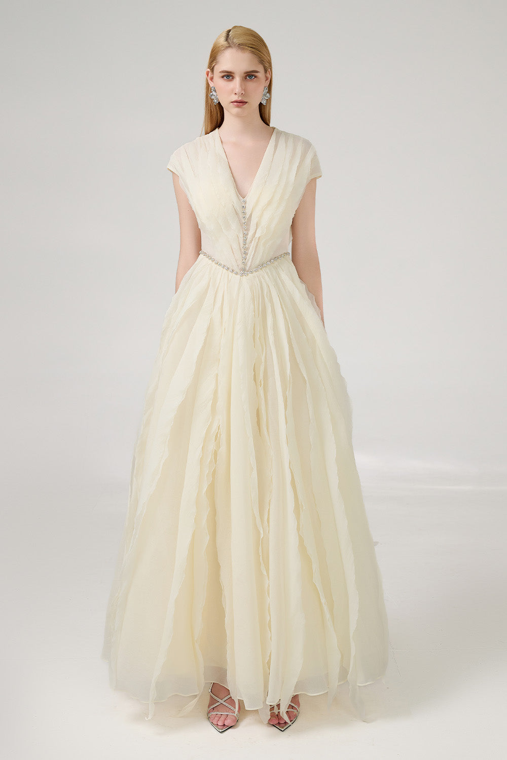 This stunning gown features a timeless v-neck design and is expertly crafted with high-quality organza fabric. The floor-length cut is perfect for any formal occasion and will make you feel like royalty. Upgrade your wardrobe with this luxurious dress.