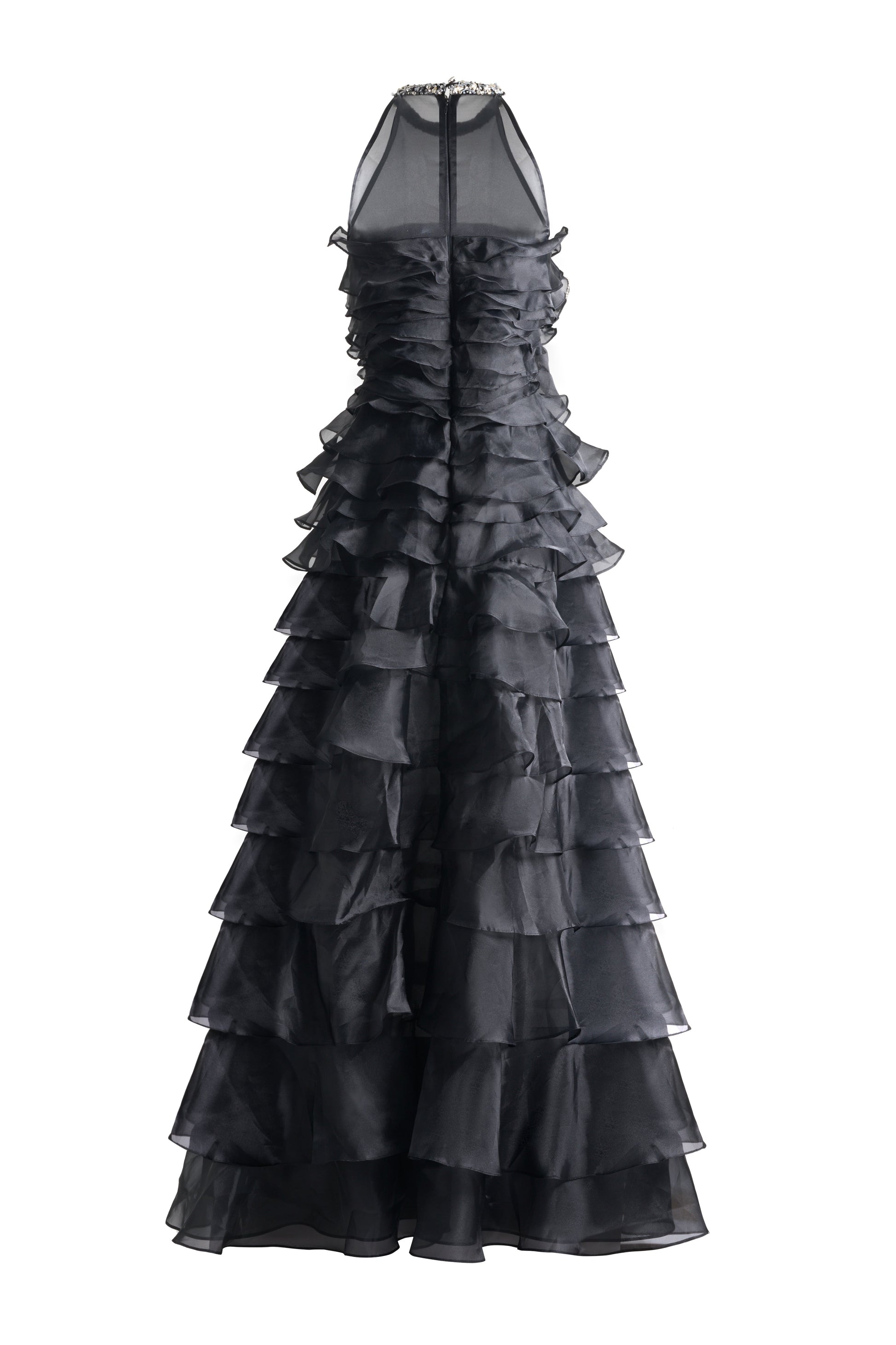 The dress features a graceful A-line silhouette enhanced by delicate ruffle layers that add texture and movement. Crafted from high-quality polyester, this dress offers both structure and flow, creating an elegant profile suitable for formal occasions. The layered ruffles provide a sophisticated detail that elevates the classic maxi dress, making it a refined choice for those seeking expert design and timeless style.