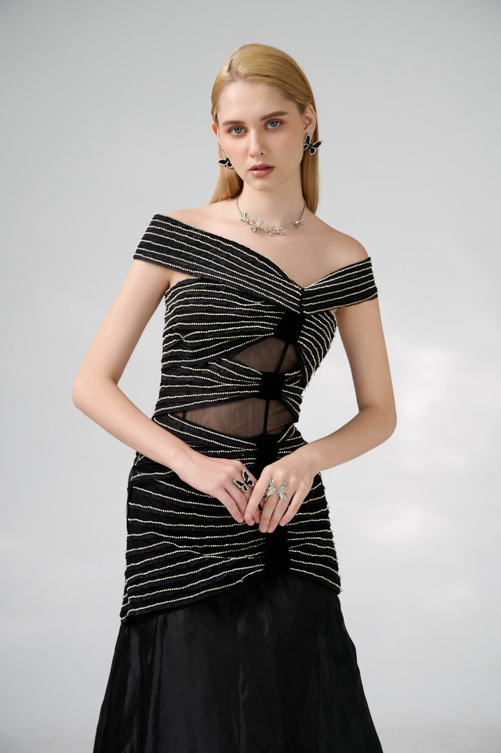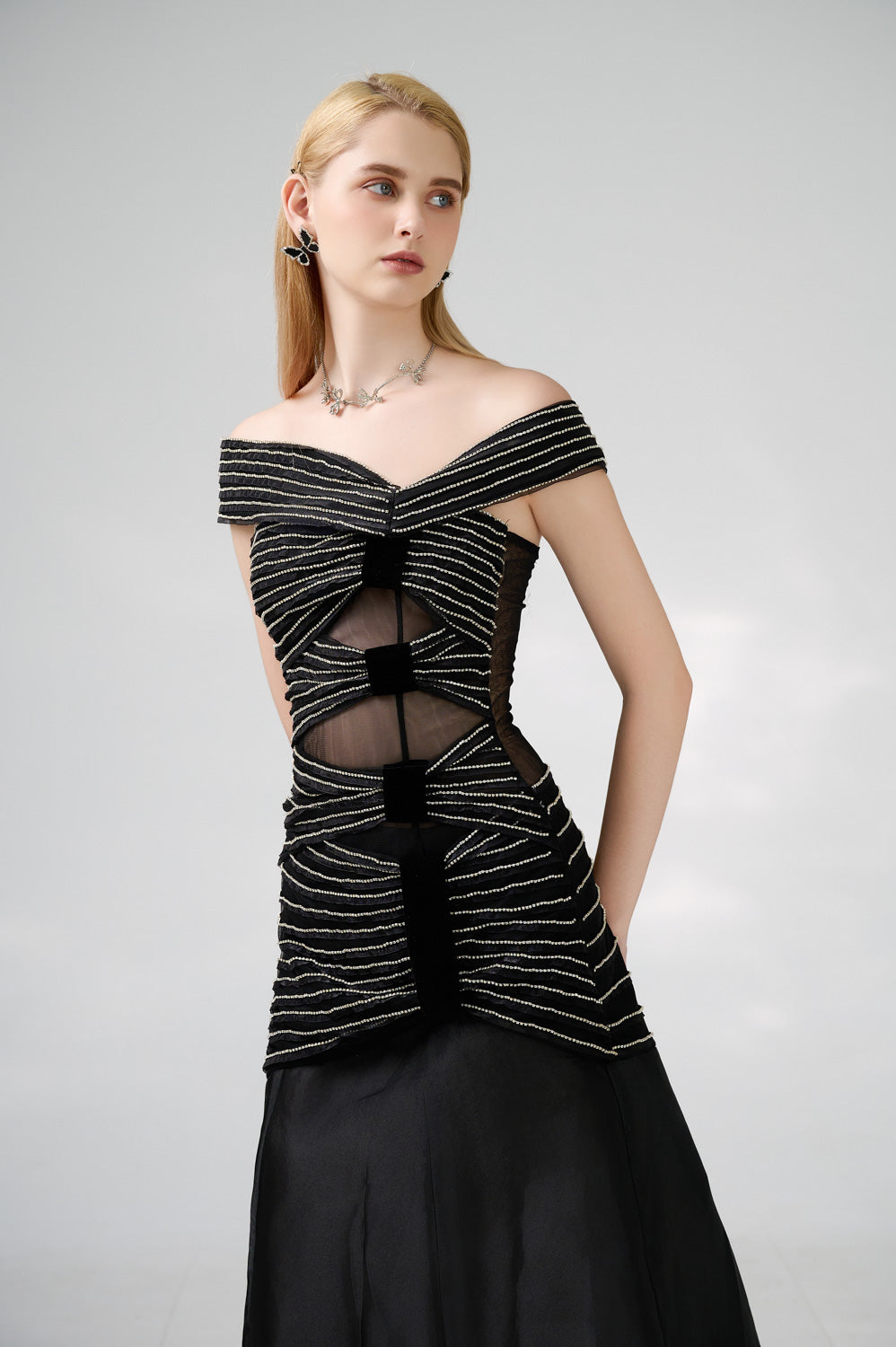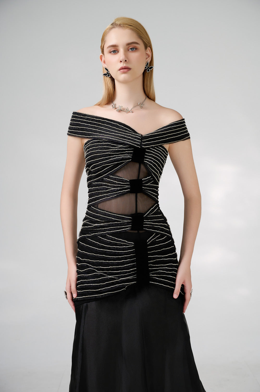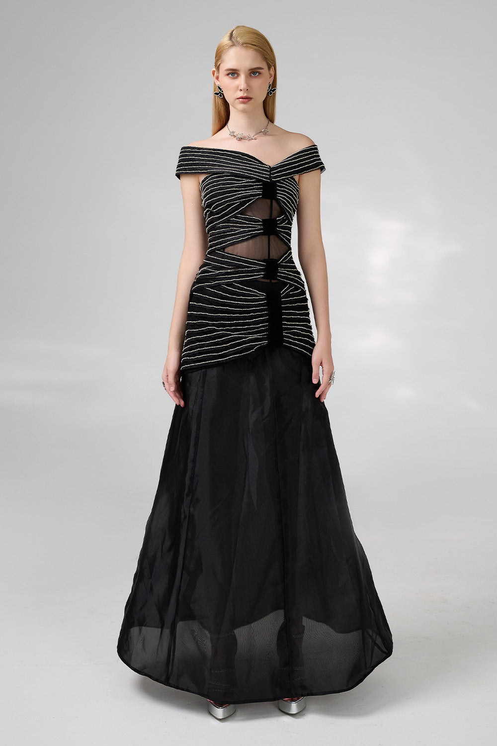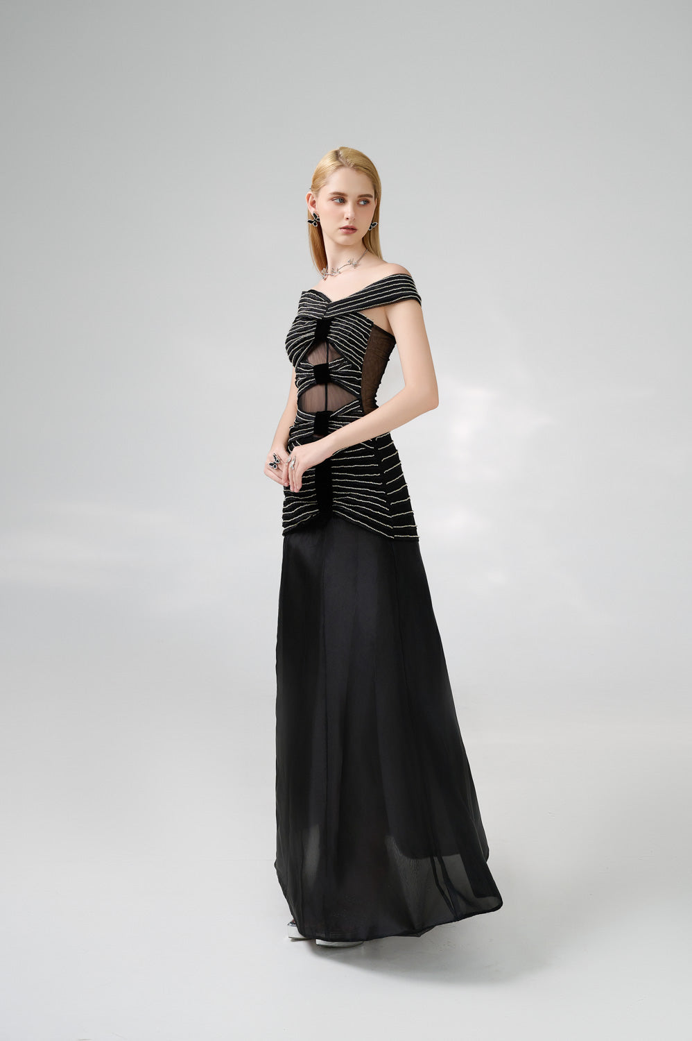 - Special Features: Off-the-shoulder dress with stones, Wide flared a-line skirt, Bow-shape on the upper body, Sheer design