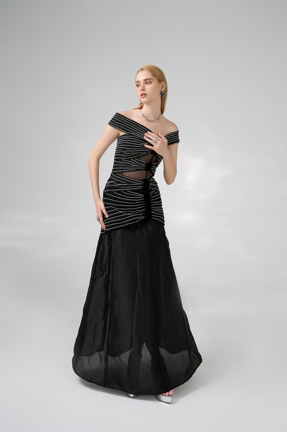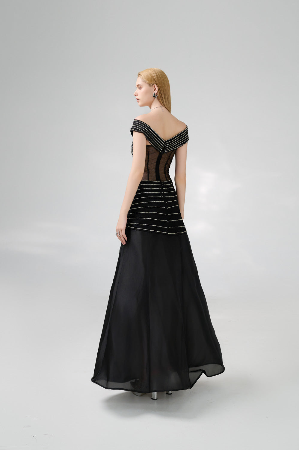Expertly crafted and designed for a flattering fit, the dress showcases a drop waist and off-shoulder design, made with delicate organza fabric that cascades into a stunning floor length silhouette. Elevate your formal ensemble with this statement piece.