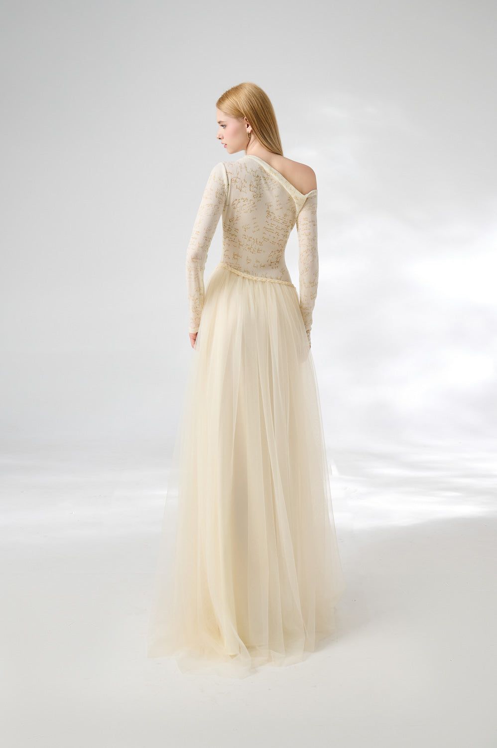 Huffman Gathered Asymmetric Sleeved Cotton Mesh Floor Length Dress