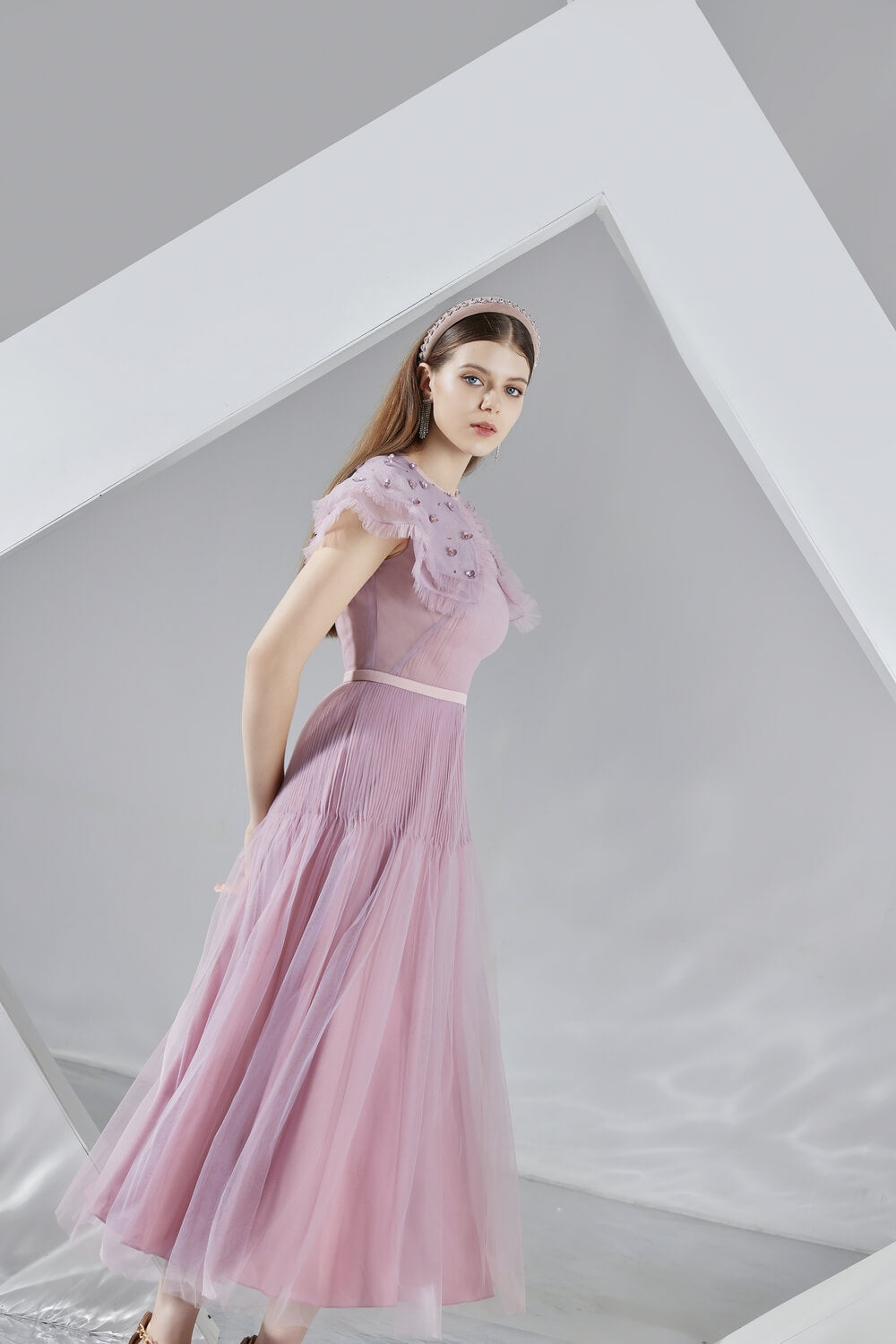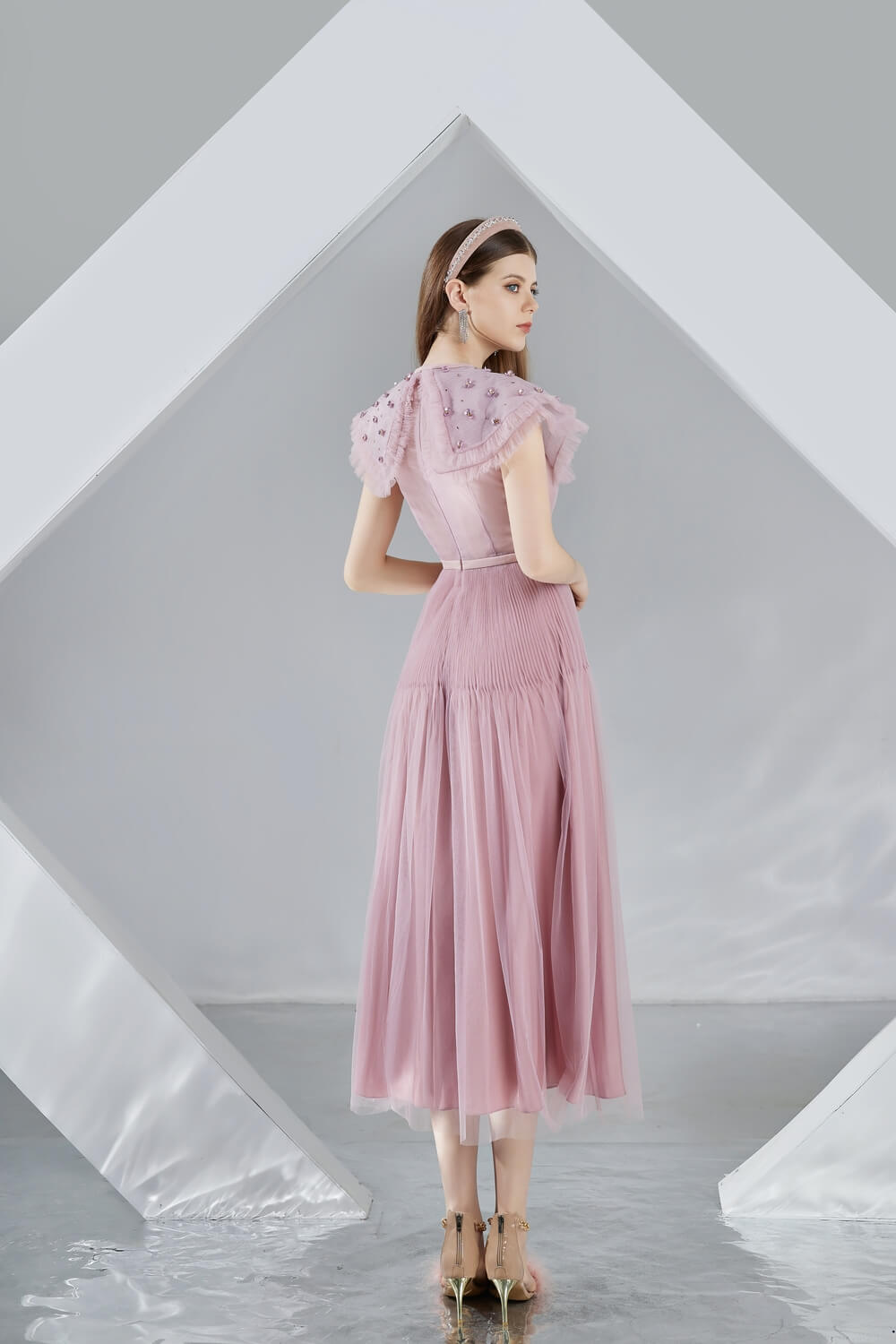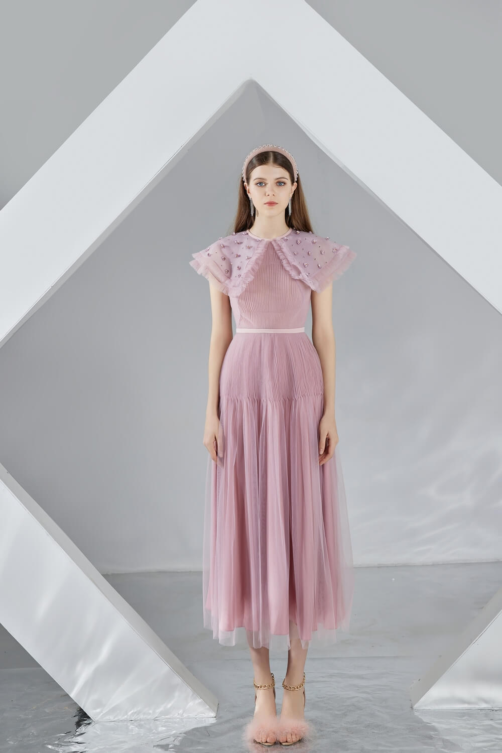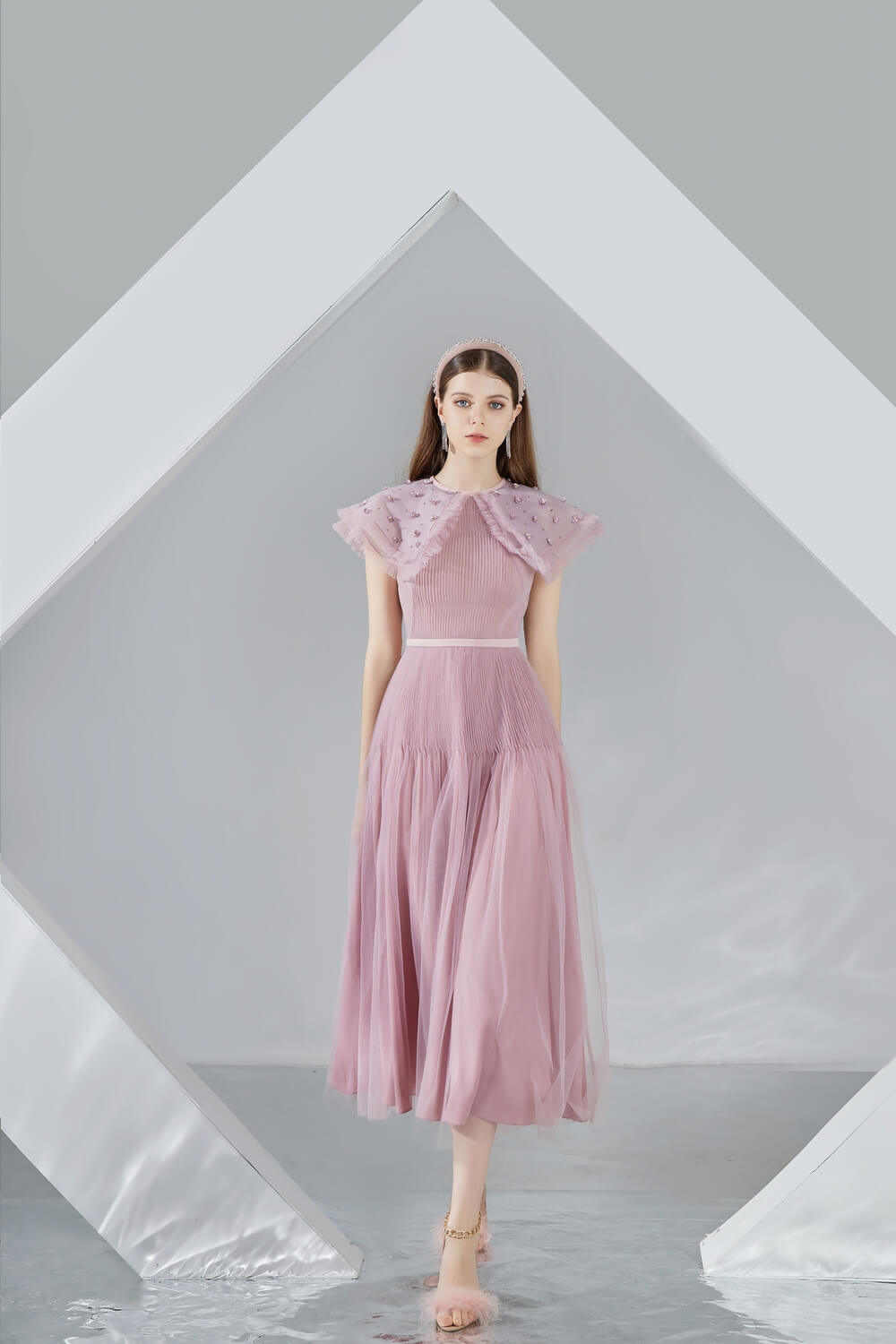 This midi dress is truly special. With its cape shoulder and pleated design, it offers a sophisticated look with a touch of elegance. Perfect for formal events, you'll look stunning and feel confident wearing it.
