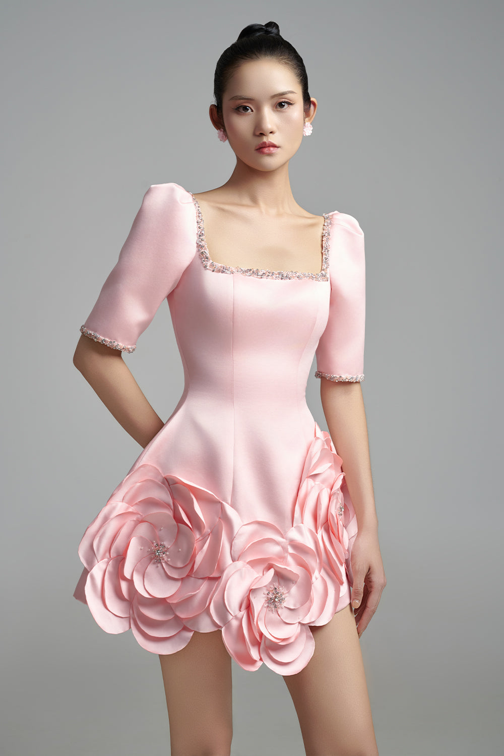 Simple, yet far from ordinary, this design is elevated by exquisite embellishments along the neckline, sleeve edges, and three oversized rose appliqués that bloom gracefully at the hem. Each detail is thoughtfully placed to add texture and charm without overwhelming the silhouette. A perfect choice for parties and elegant events, this dress radiates sweetness and a fresh, youthful spirit.