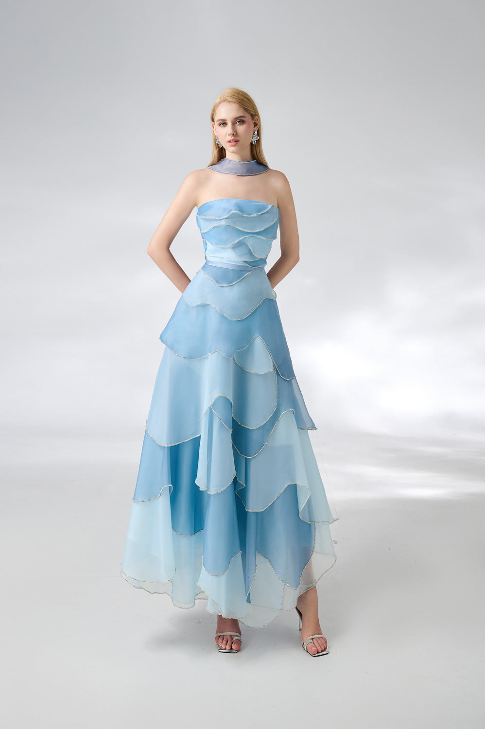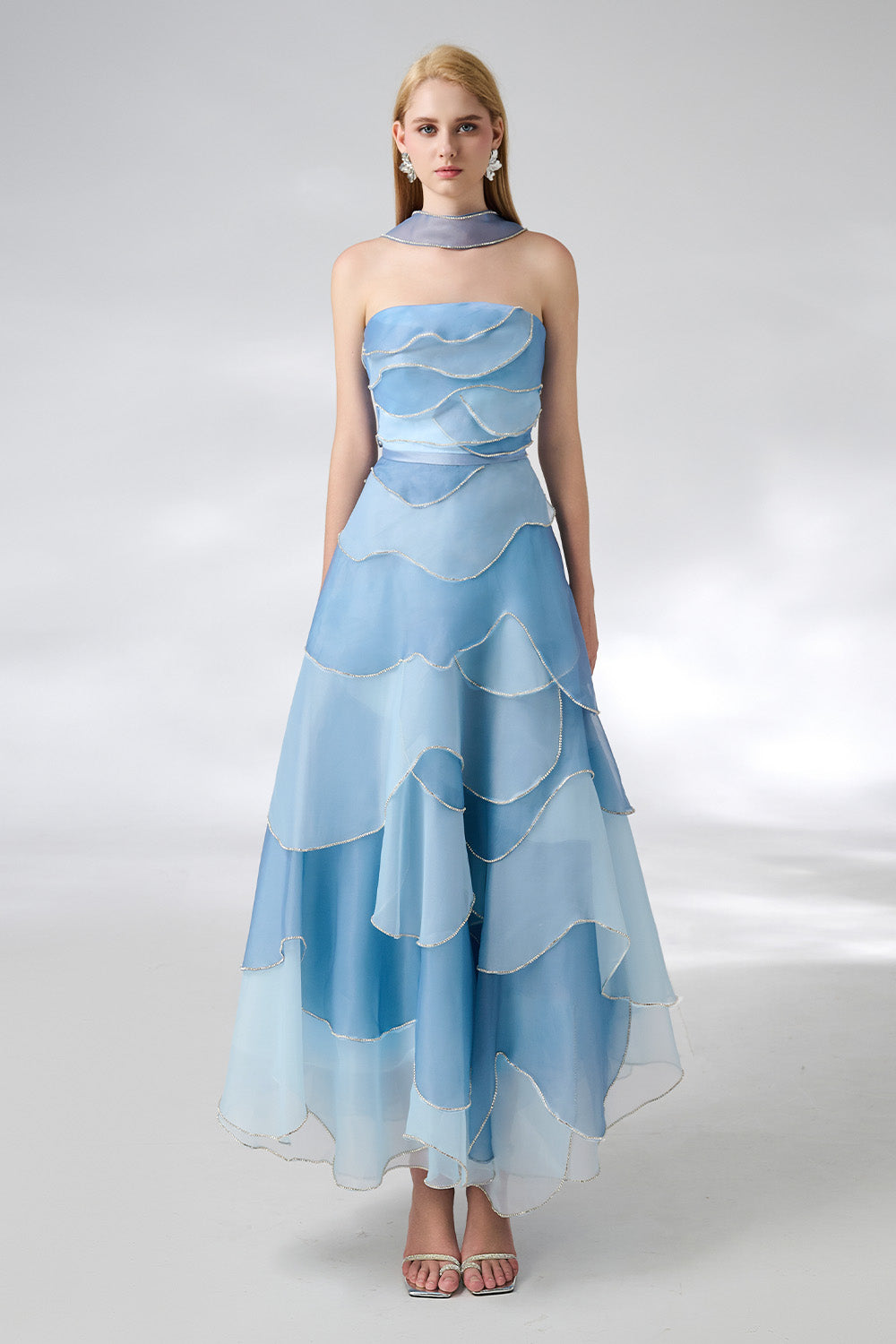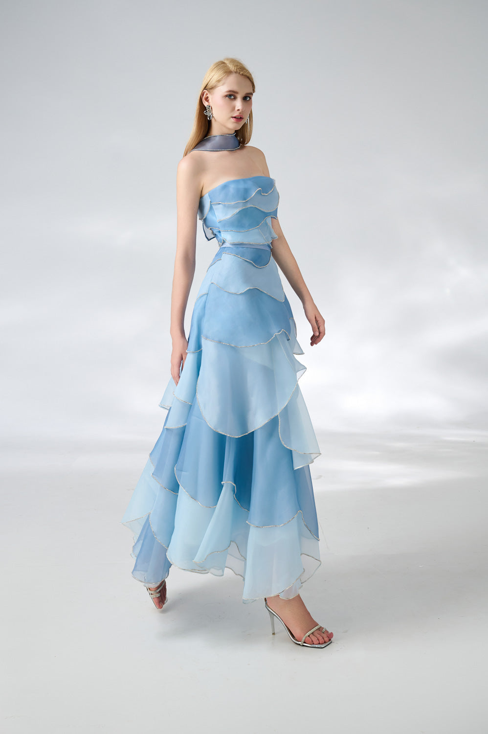 Leonard Layered Straight Across Neck Organza Ankle Length Dress