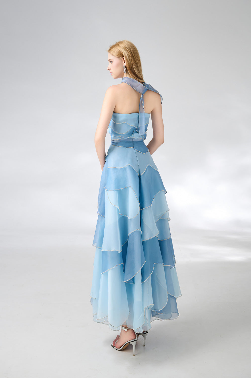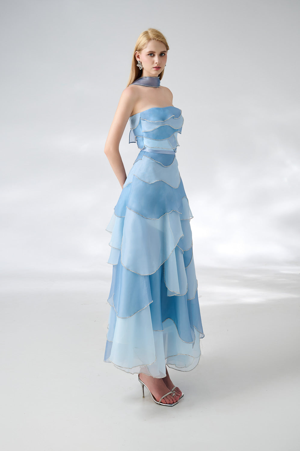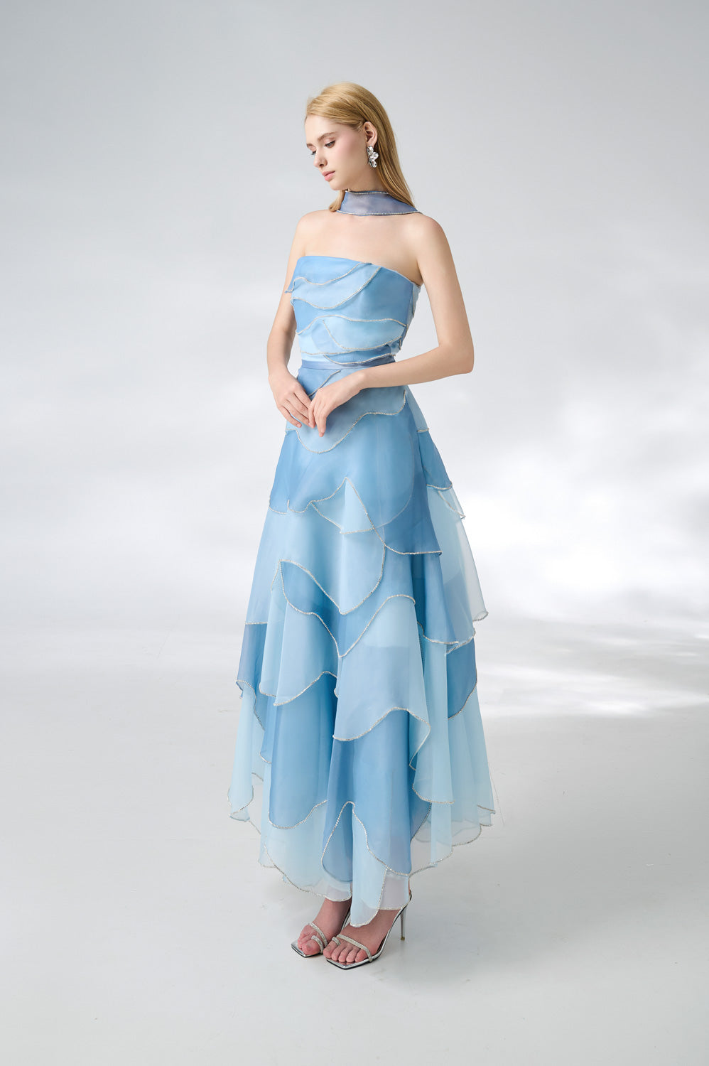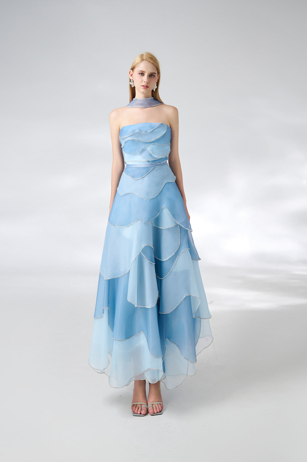 Leonard Layered Straight Across Neck Organza Ankle Length Dress