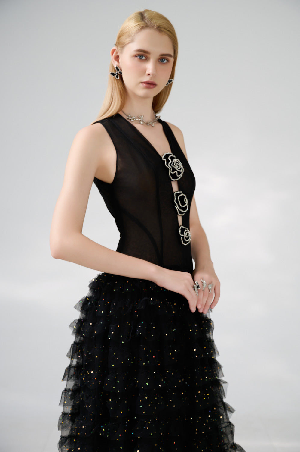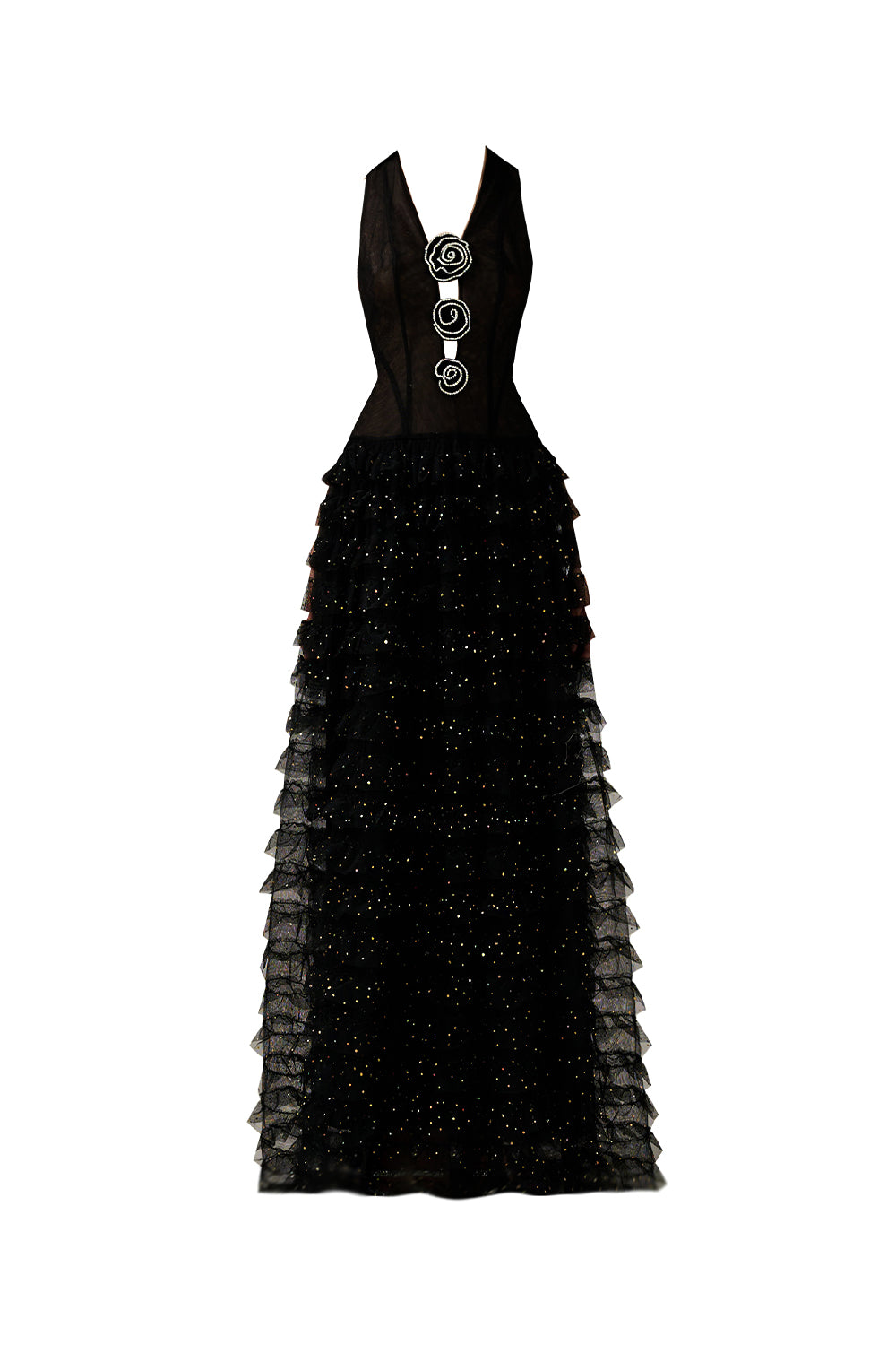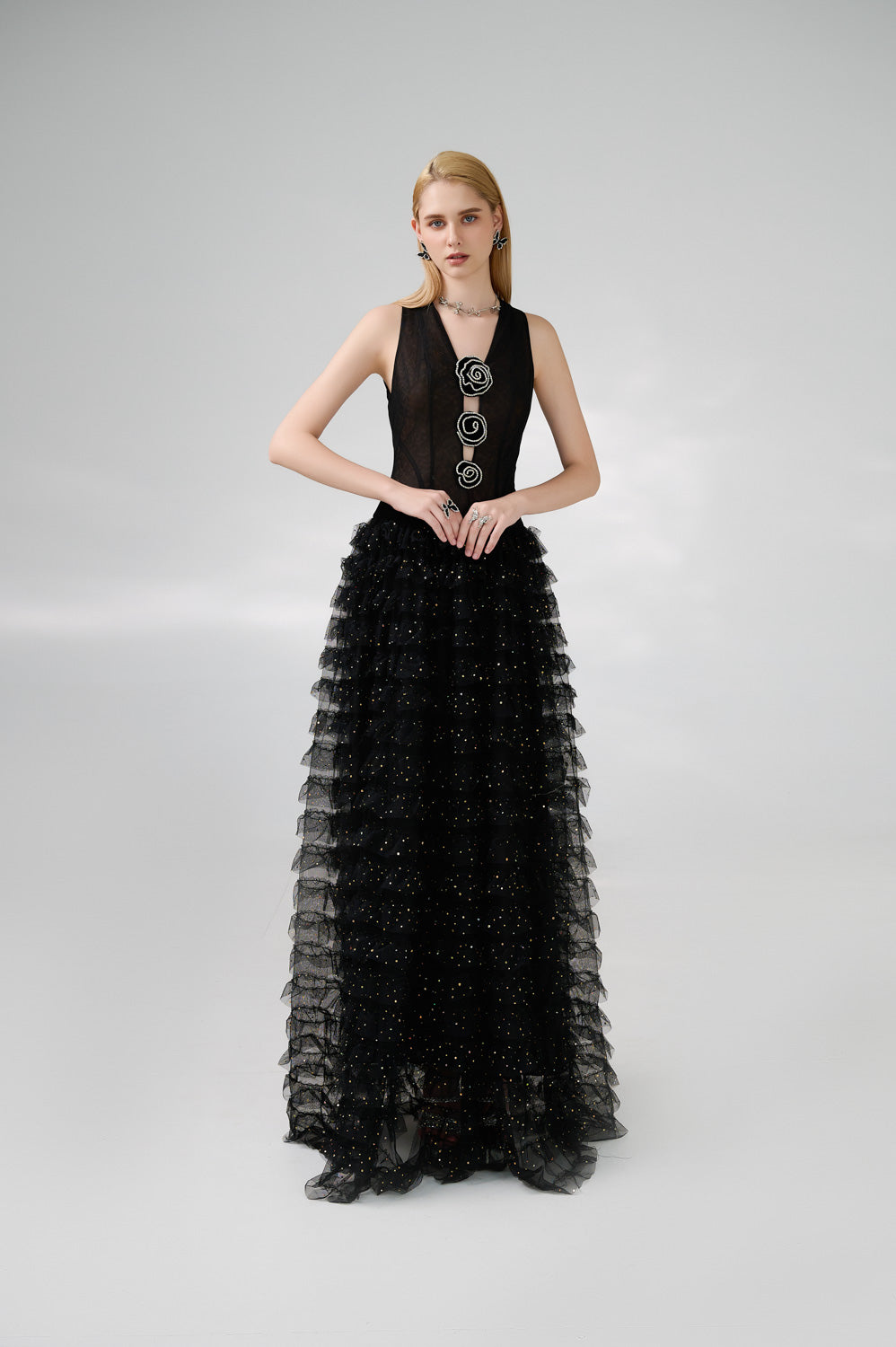 - Special Features: Ruffle layers with stones, Attached roses in rows on the chest