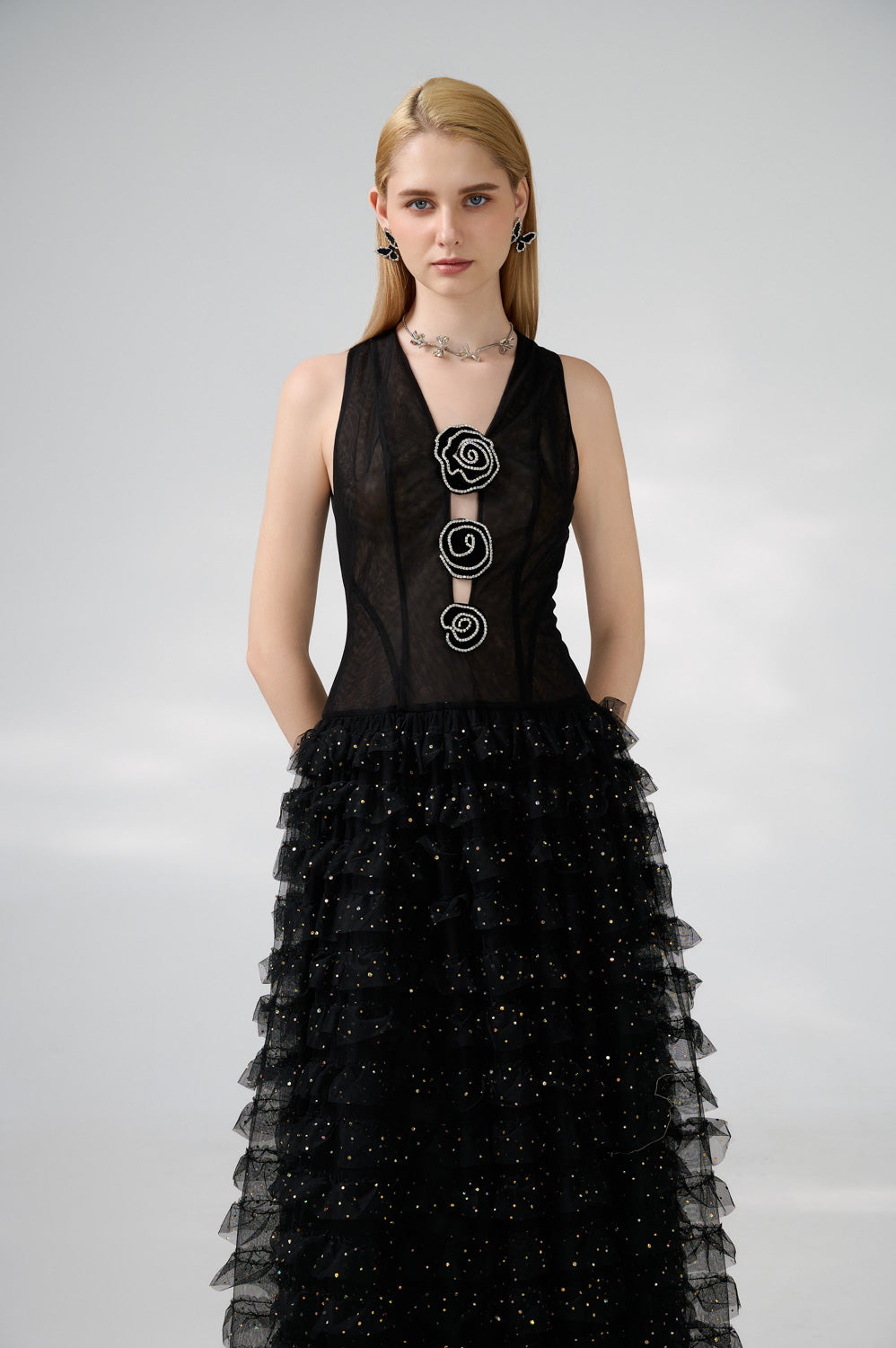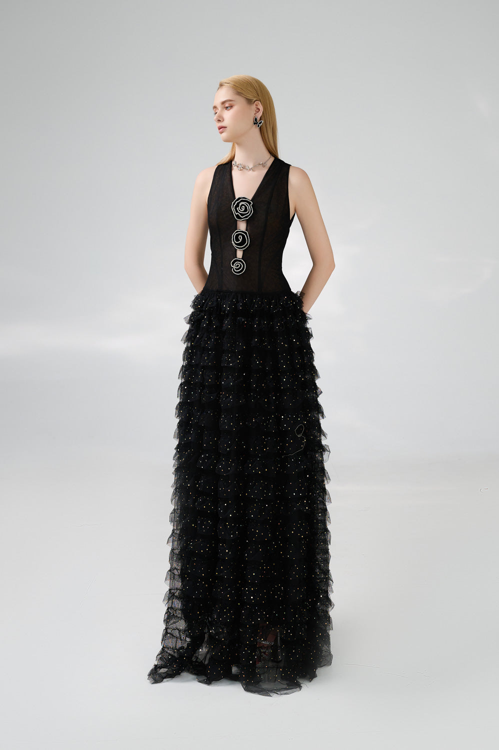 The dress is the perfect addition to any formal event. With its flowing layers of organza and a floor-length design, this dress exudes elegance and grace. The sleeveless cut adds a touch of modernity, making it a timeless and versatile piece.