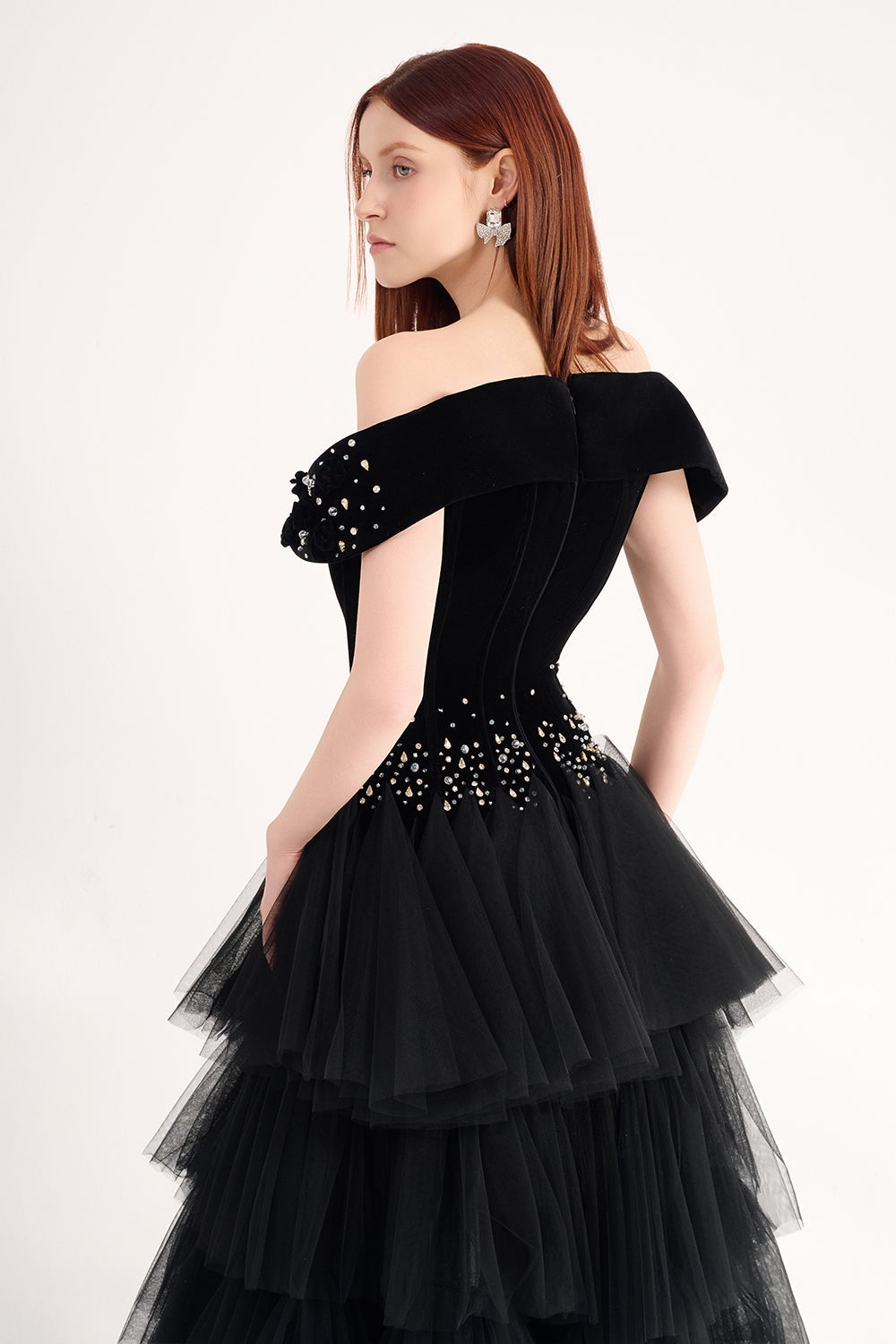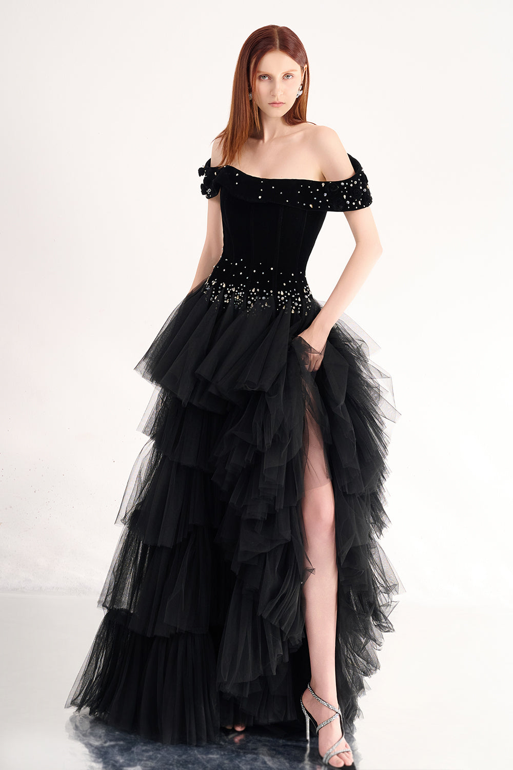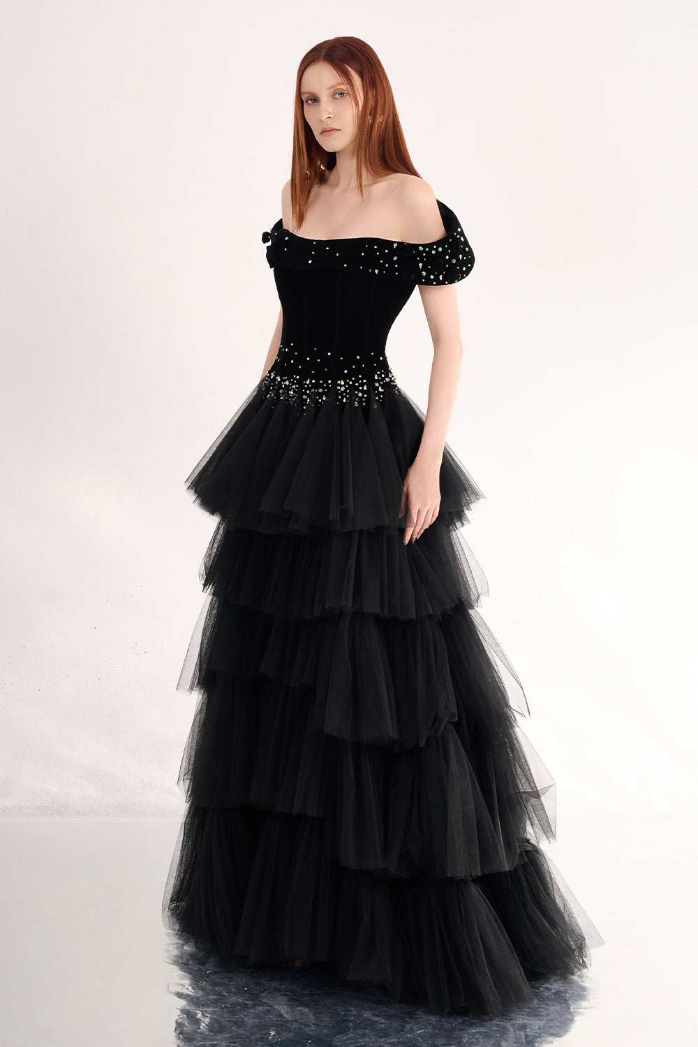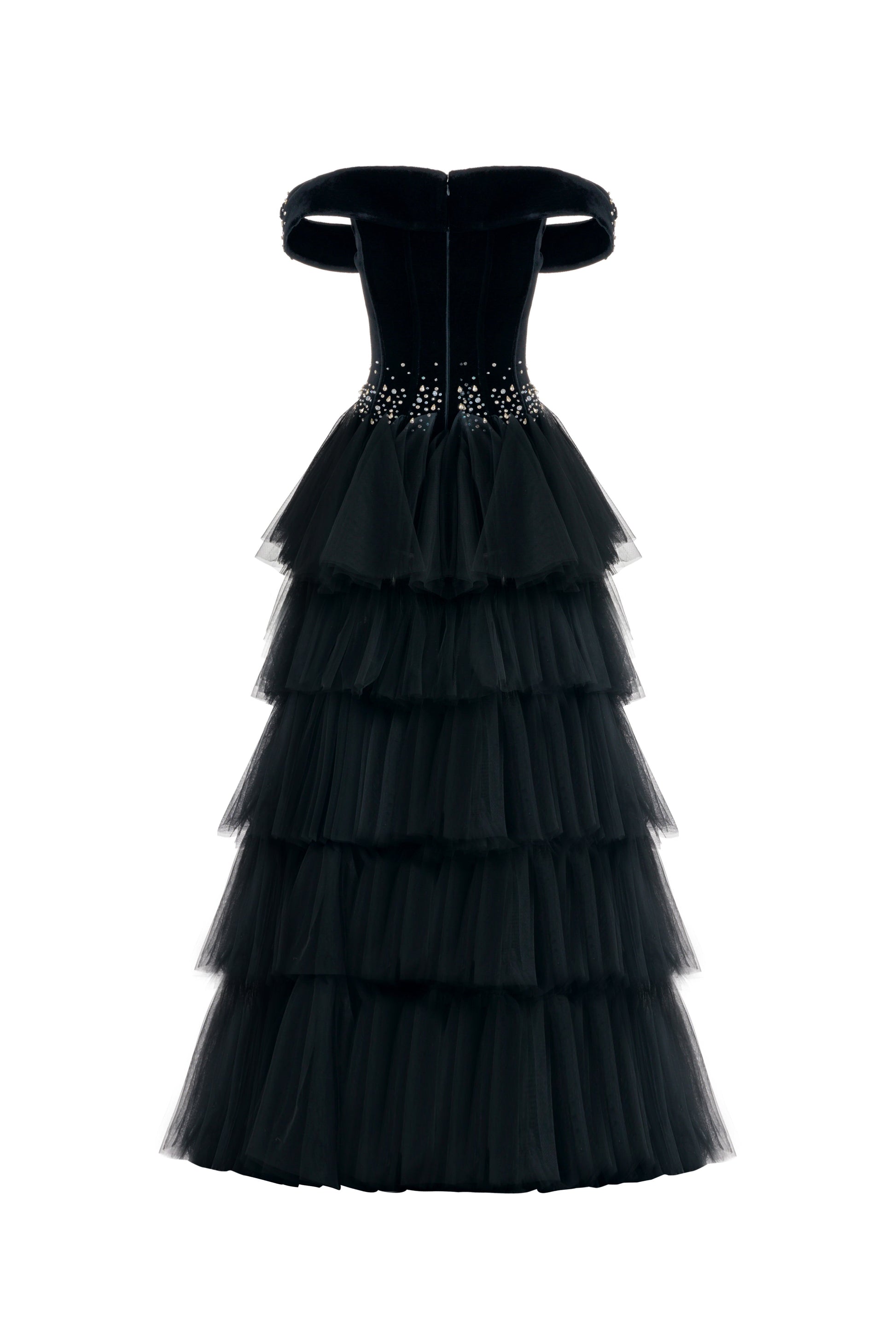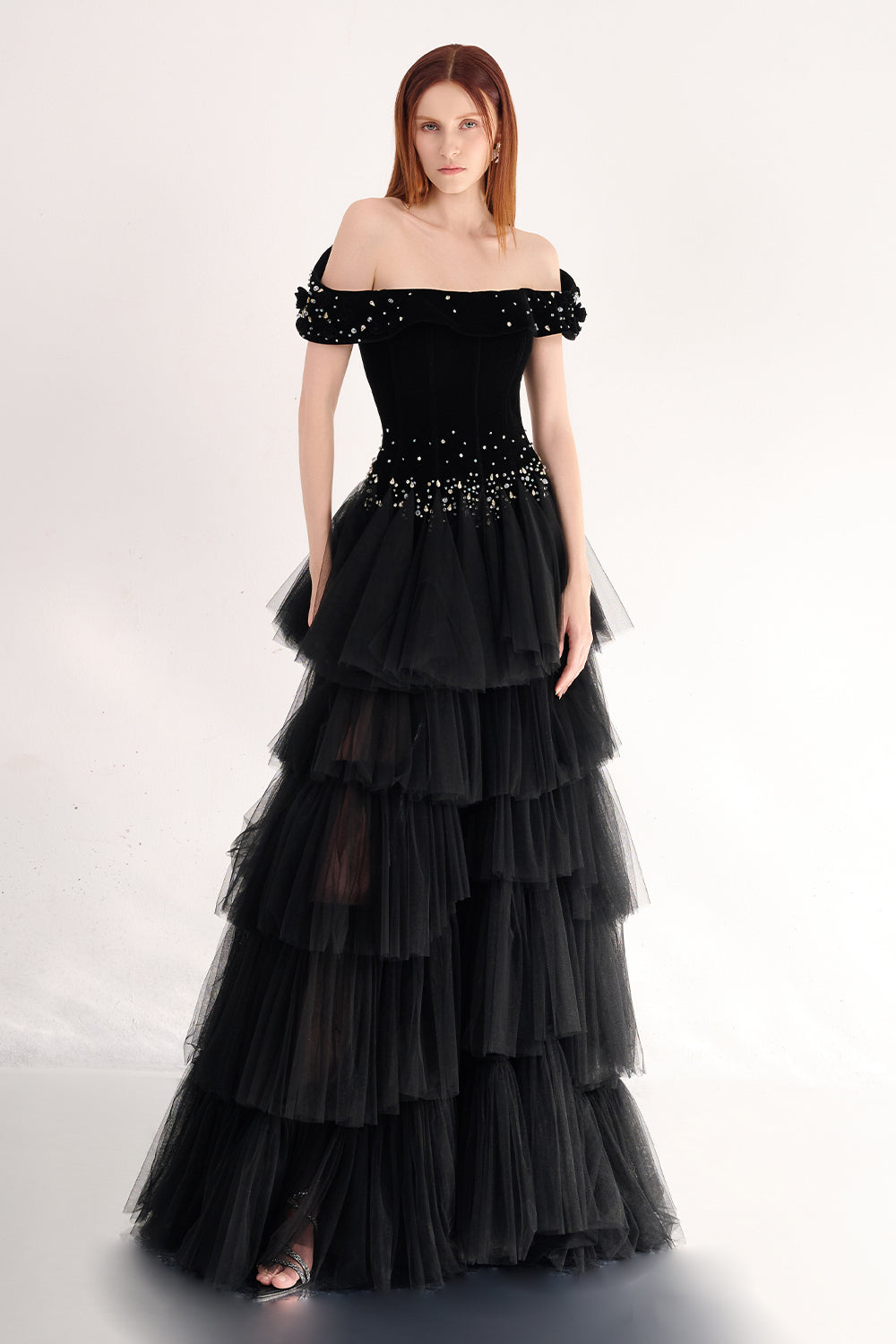 The dress offers a sophisticated silhouette with its elegant layered design and off-shoulder neckline. Crafted from lightweight polyester, it ensures comfortable wear while maintaining a graceful drape. Ideal for formal occasions or stylish evenings, this maxi dress combines timeless style with expert tailoring for a flattering fit.