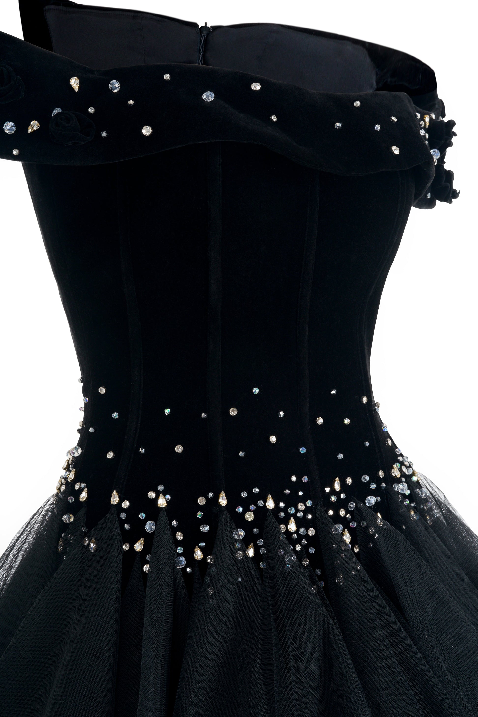 Special Features Slit on the side, Gathered layer bottom, Attached rhinestone on the neckline and waist