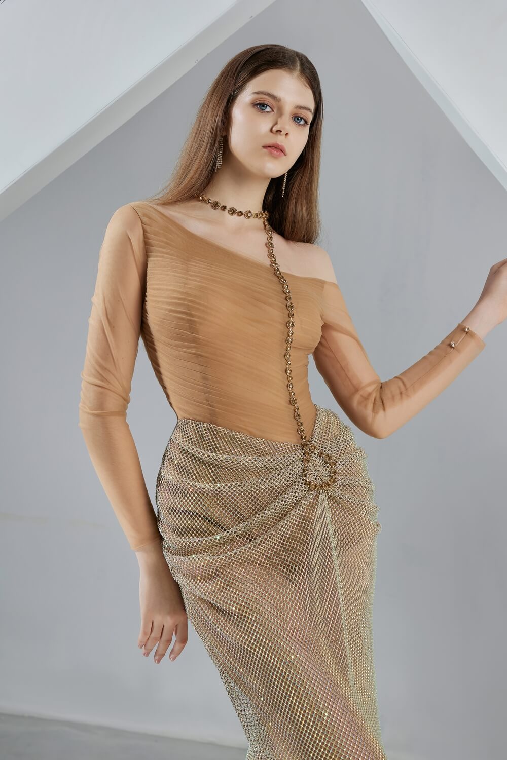 Be sure to impress in this gorgeous Skyla Bodycon Organza Maxi Dress! The fitted form and one-shoulder design is sure to get heads turning. But the real star of the show? The stylized stone string that will have you glistening like a disco ball! Steal the night in this show-stopper - no one will be able to resist!