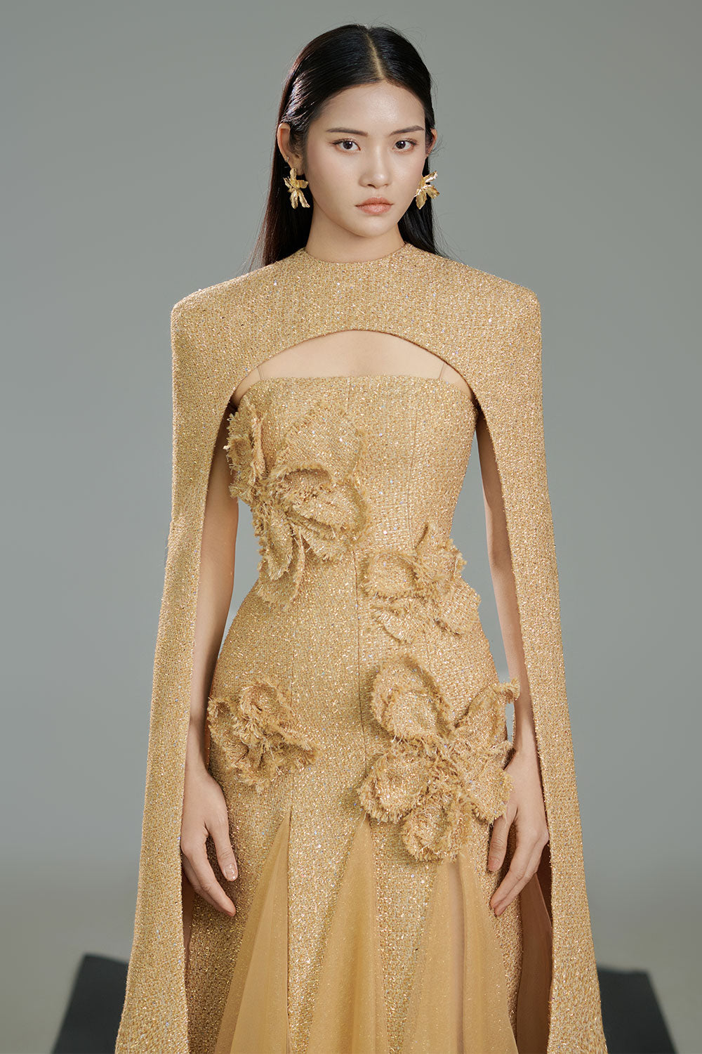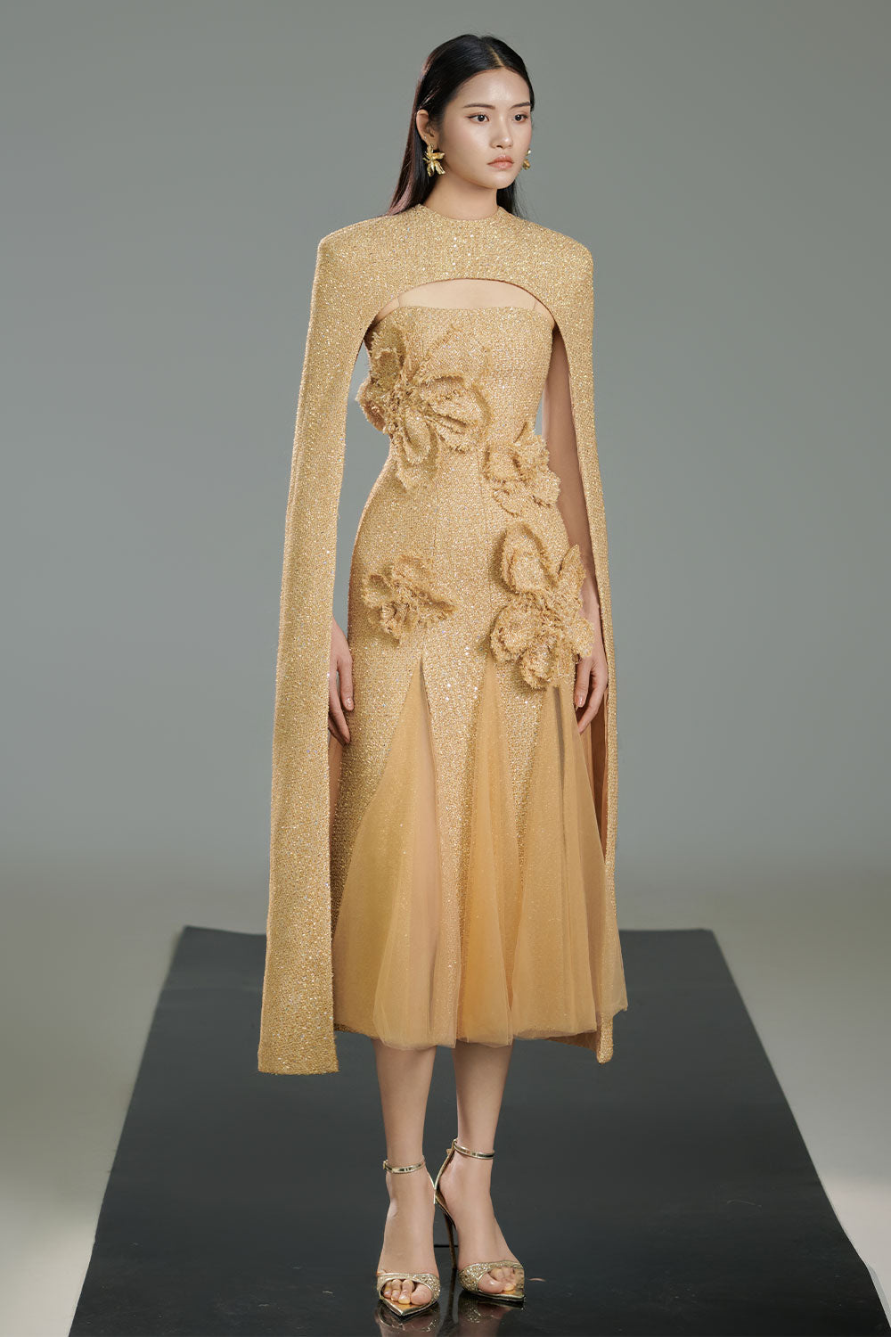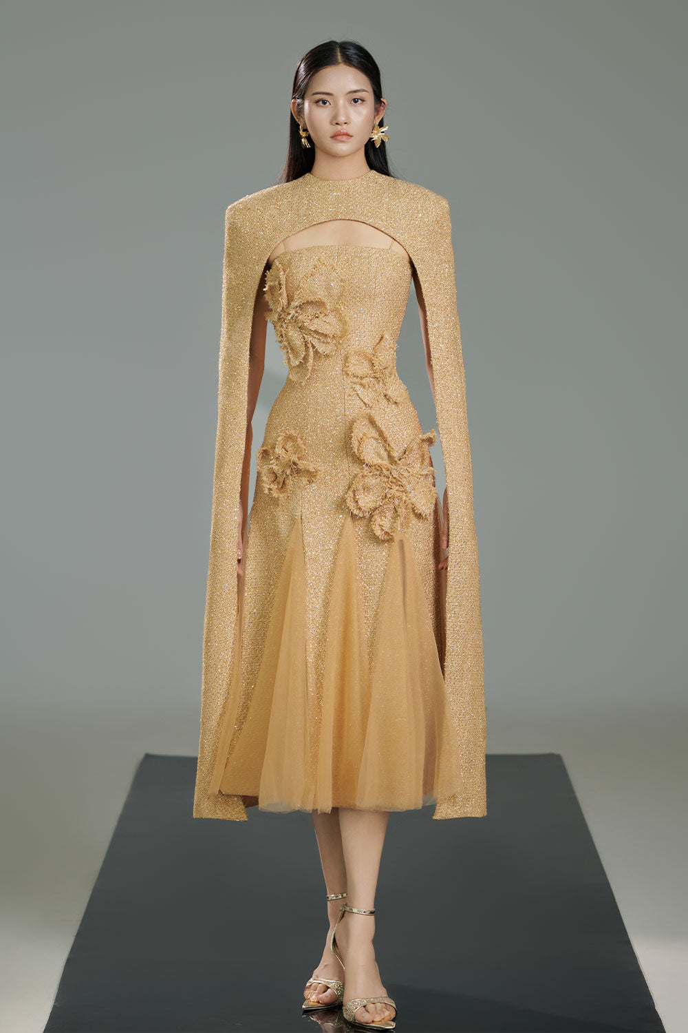 This elegant set is a must-have for any fashion-forward individual. Made from high-quality polyester, this set features delicate flower appliques on the cape, adding a touch of femininity to the classic midi silhouette. Perfect for any special occasion, this set offers both style and comfort.